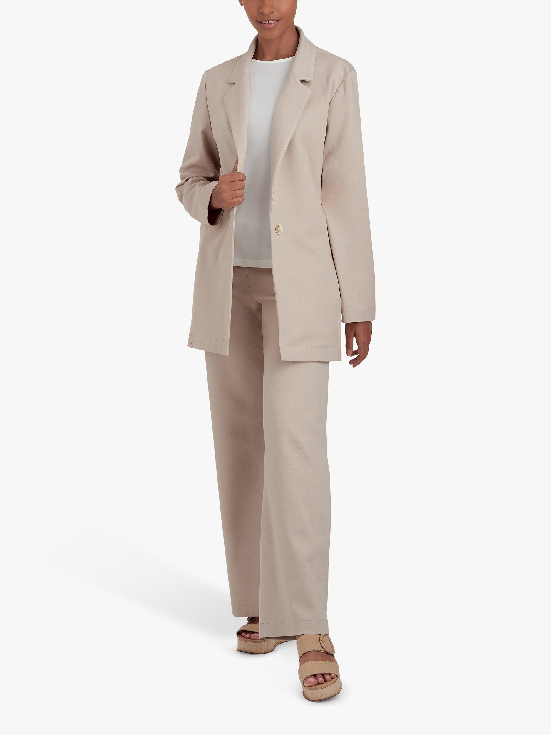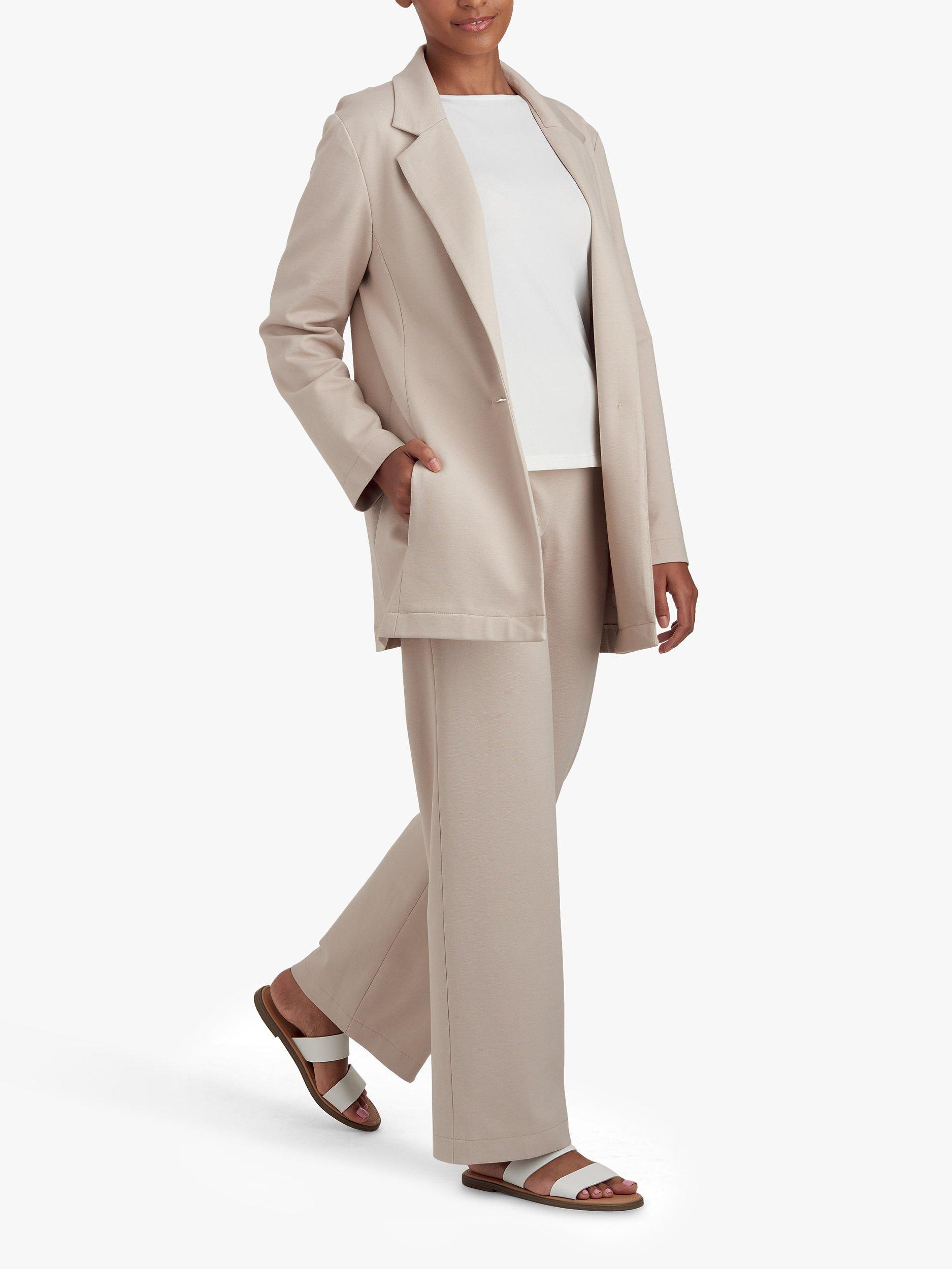 This one button unlined jacket has hidden pockets in the princess seams; the relaxed pull-on pants have straight legs.
