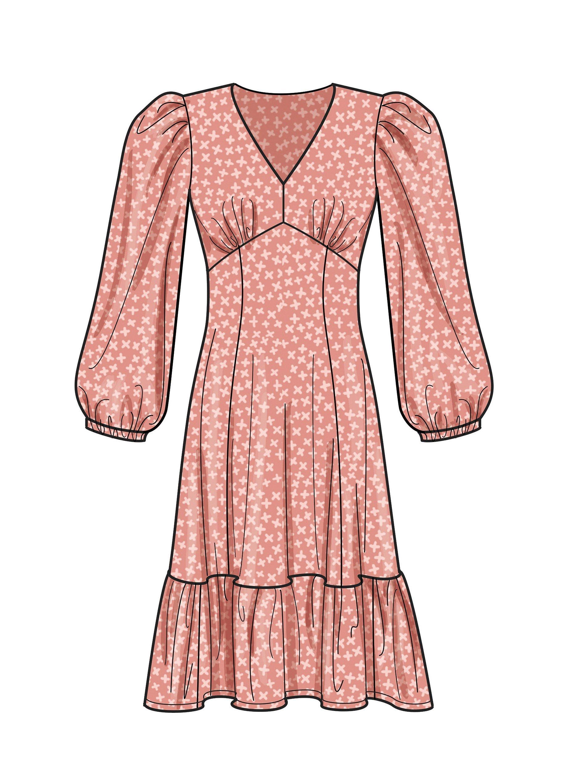 Dress has a shaped bodice and short puffed or long sleeves gathered at the wrist. Separate pattern pieces for A, B, C and D cup sizes.