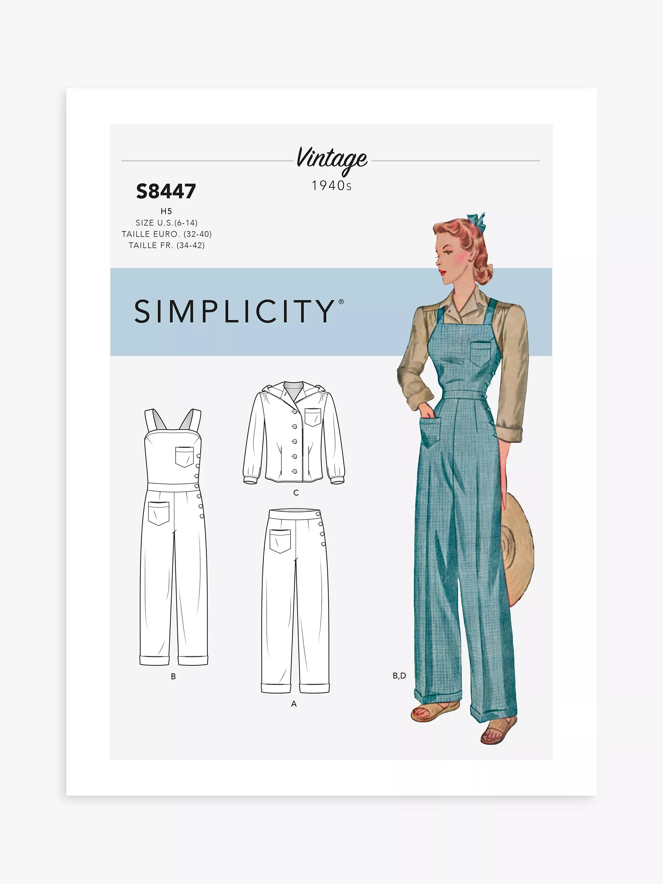 Straight the Simplicity vintage vault. Create this 1940s Rosie the Riveter-inspired sportswear. Pattern includes trousers, overalls, blouse and blouse with hood.