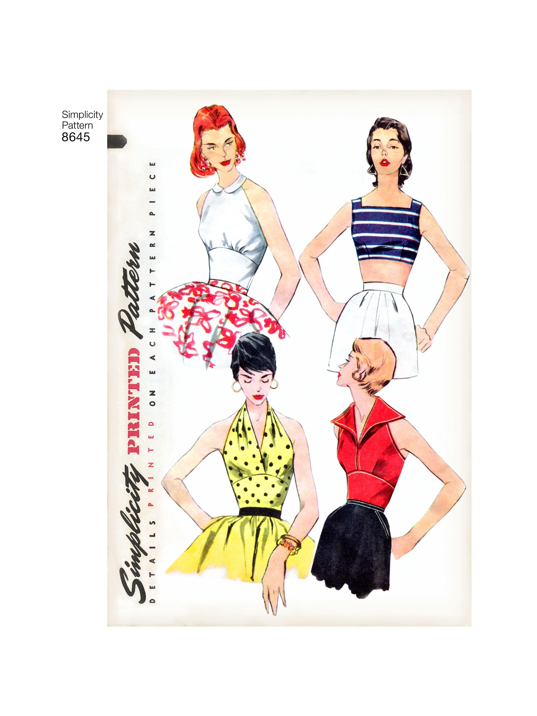 Simplicity 1950's vintage Women's set of halters and sun top: This set of three halters features figure moulding midriff sections in front and a back button closure.