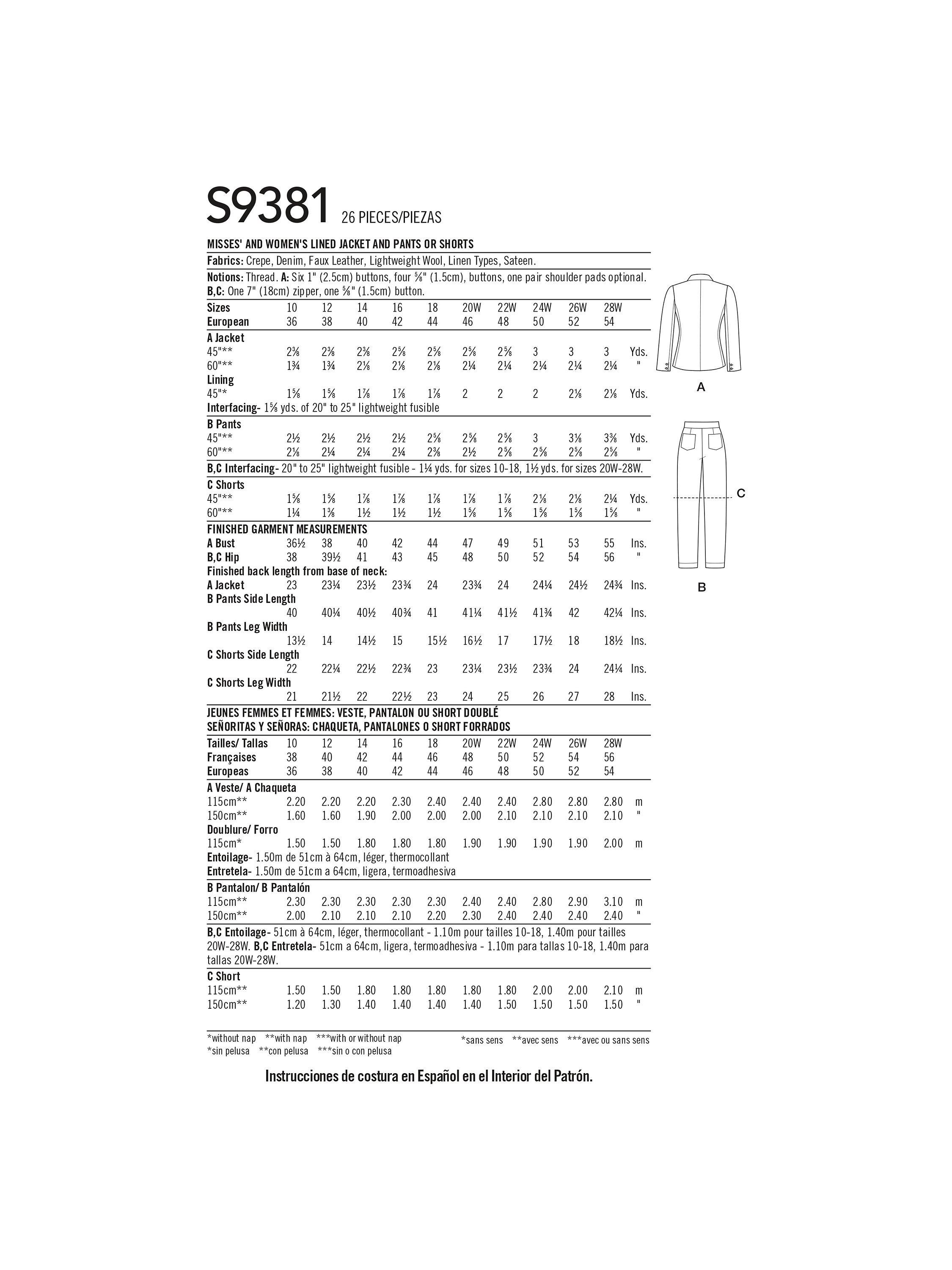 SimplicityMisses' & Women's Lined Jacket & Pants/Shorts Sewing Pattern, S9381AA