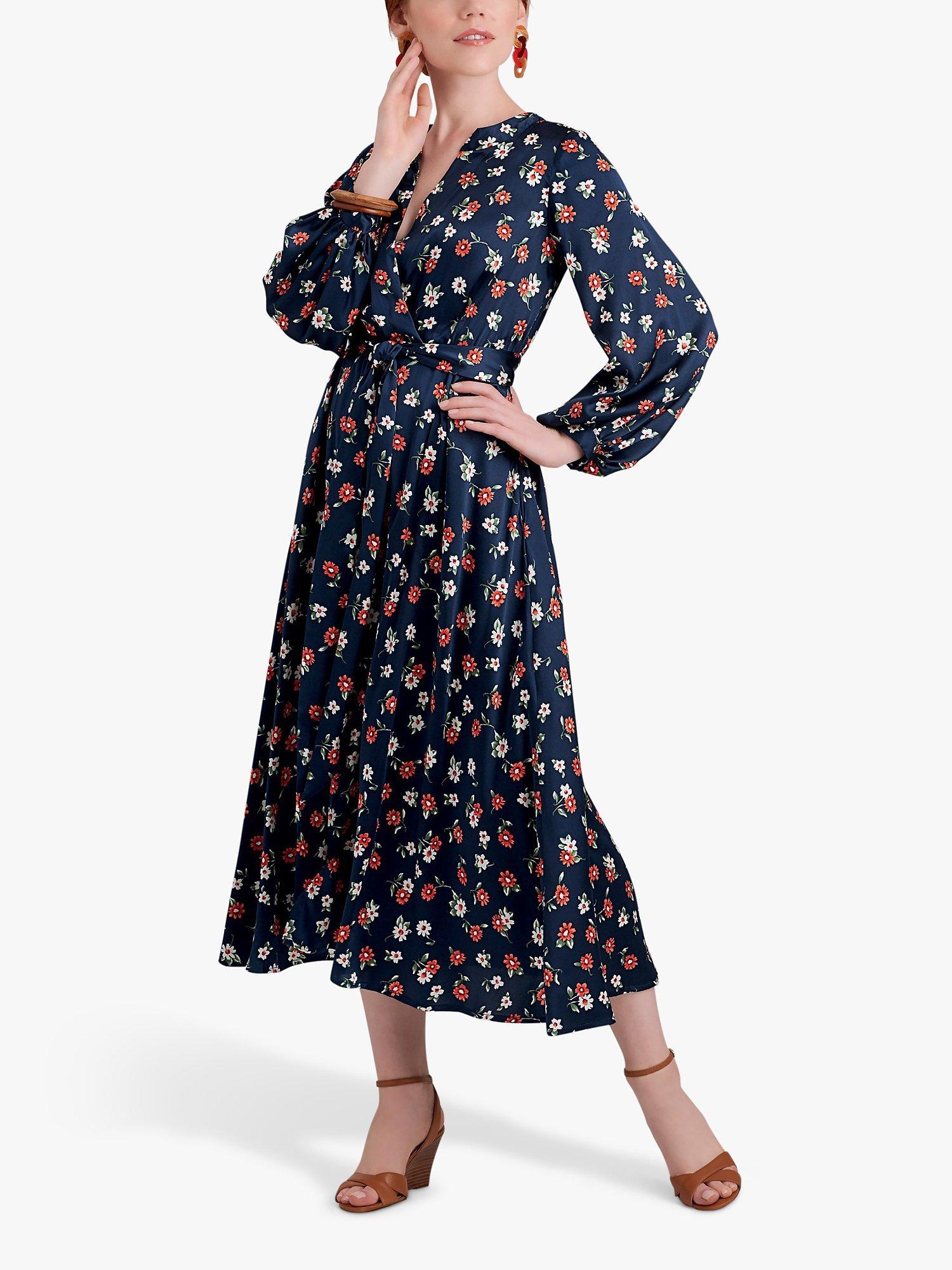 Misses' dresses with wrap-front detail on bodice and semi-full skirts. The fixed sash wraps and ties to front or back. Varied sleeves.