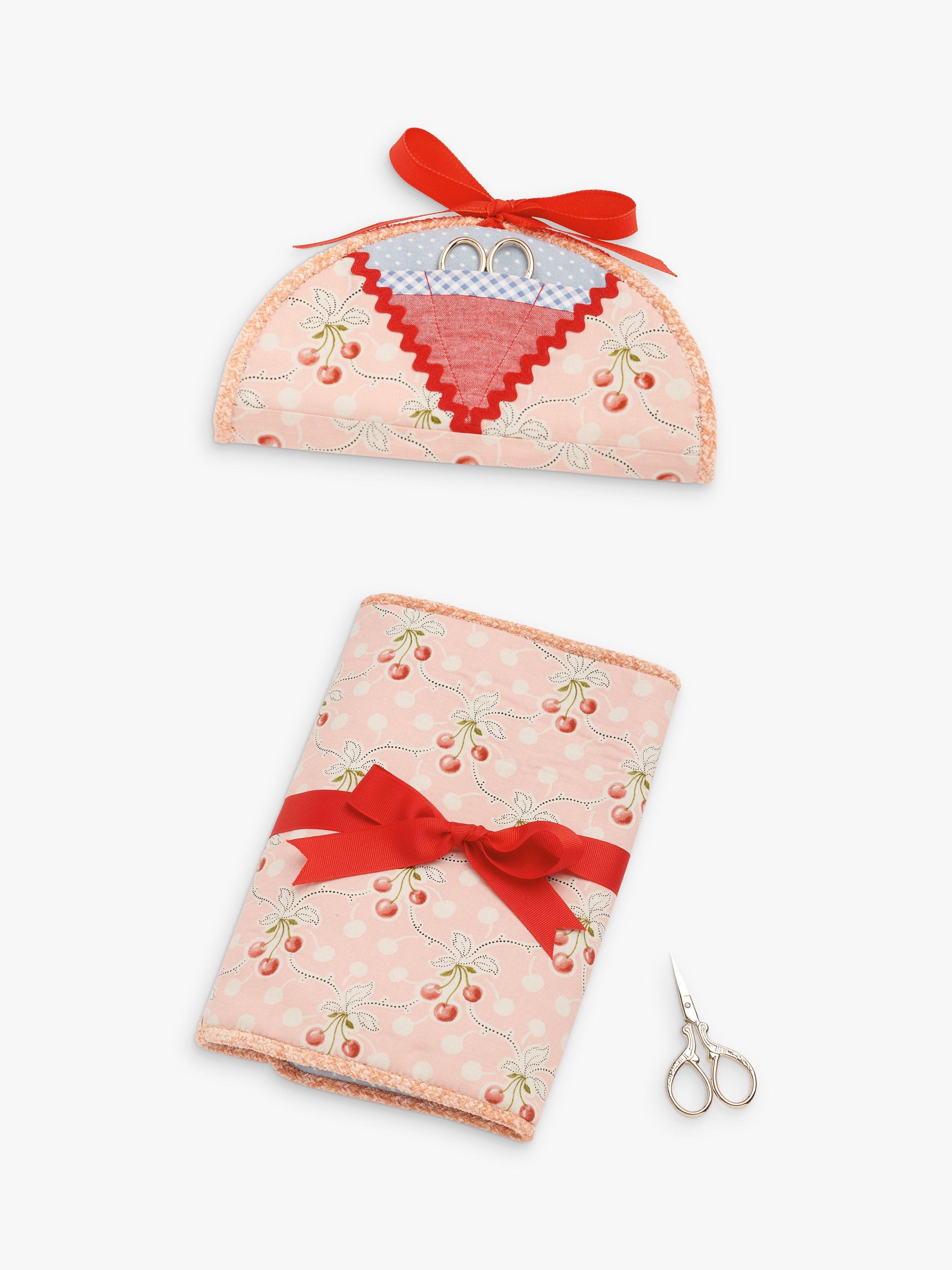Charming pincushions created with purchased dolls have weighted plush skirts and ribbon, rick rack and lace trimmings.Trifold projects organizer and oval etui have corded edges, ribbon ties and pockets, tabs and rings to hold supplies and smaller needlework projects.