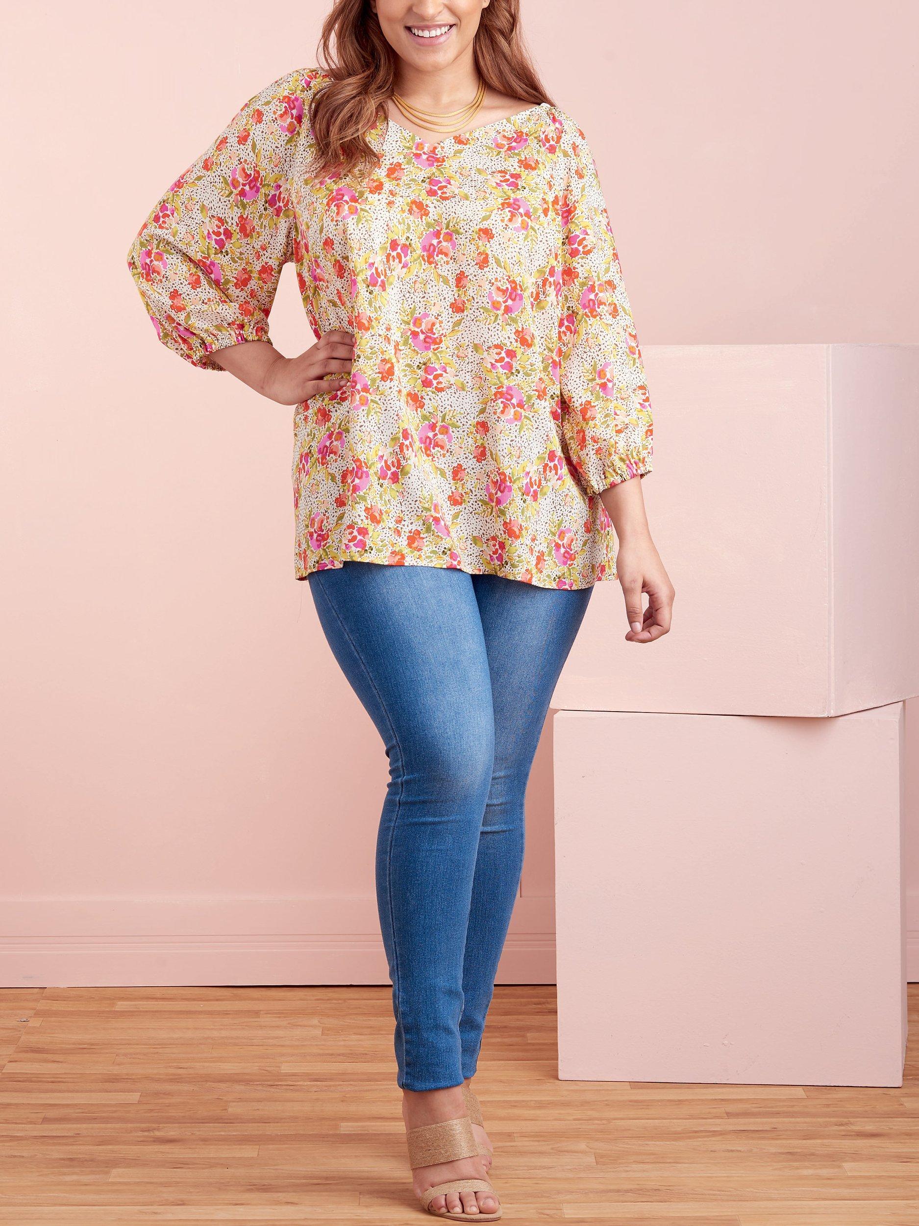 Pullover v-neck tops in two lengths with gathered three-quarter, elbow and short flutter sleeves.