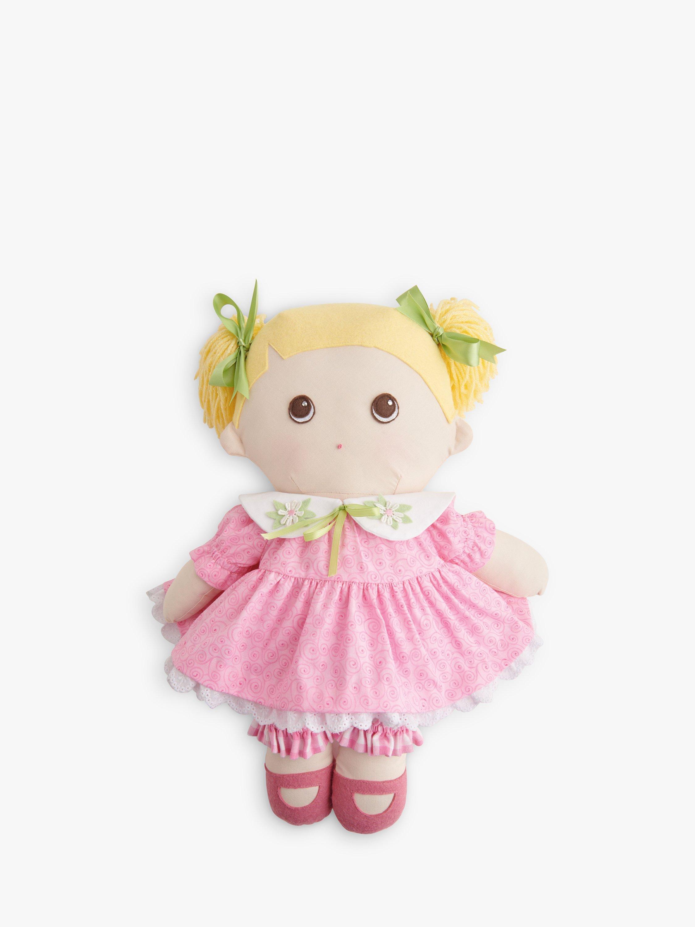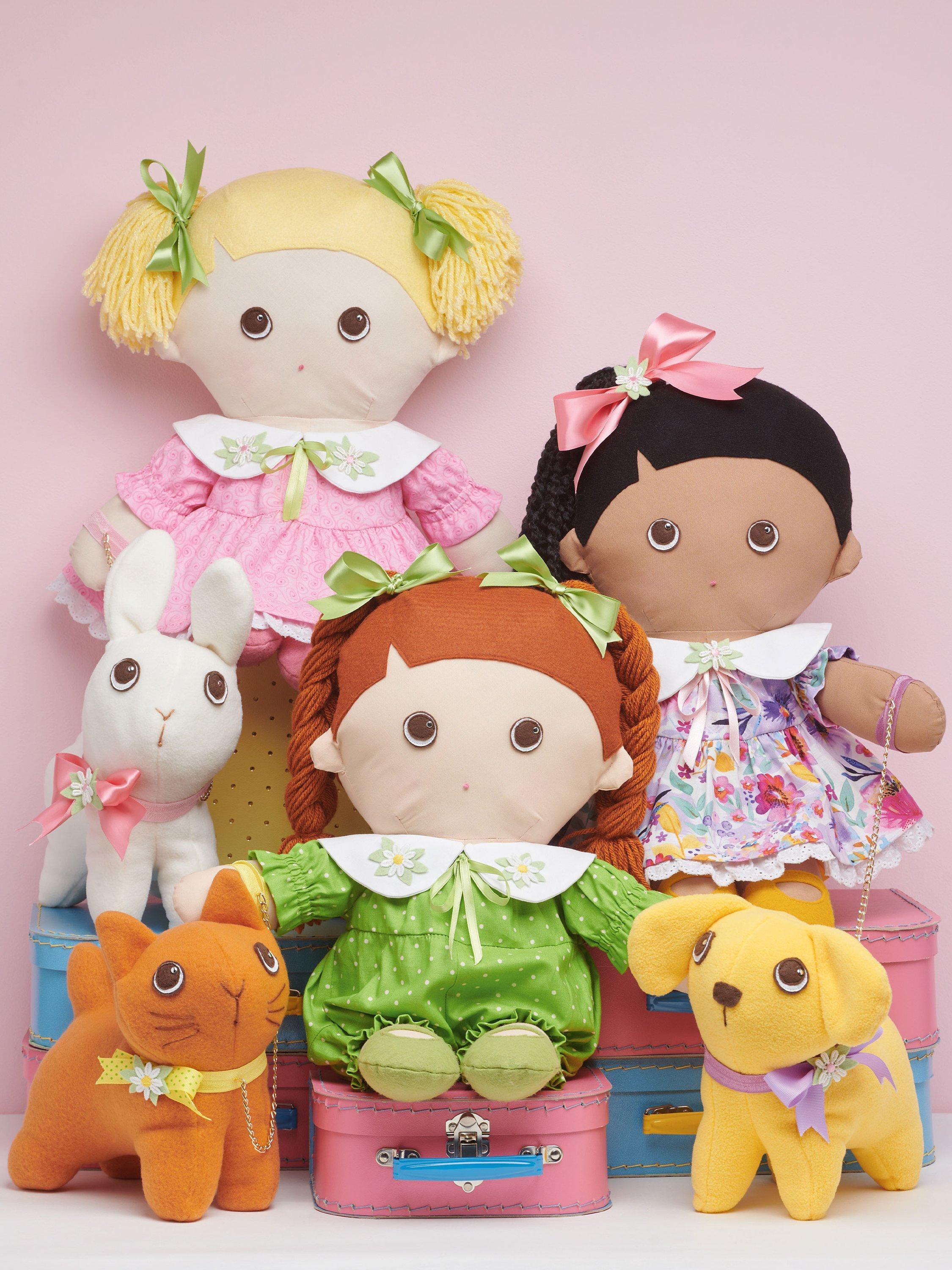 46cm tall plush dolls have simple to sew body shapes with felt and yarn hairstyle options, appliqued shoes and eyes, embroidered mouths, and detachable collar accessories.Dolls dress up in pull-on dresses worn with contrast bloomers or pull-on jumpsuit, all with elasticated edges.
