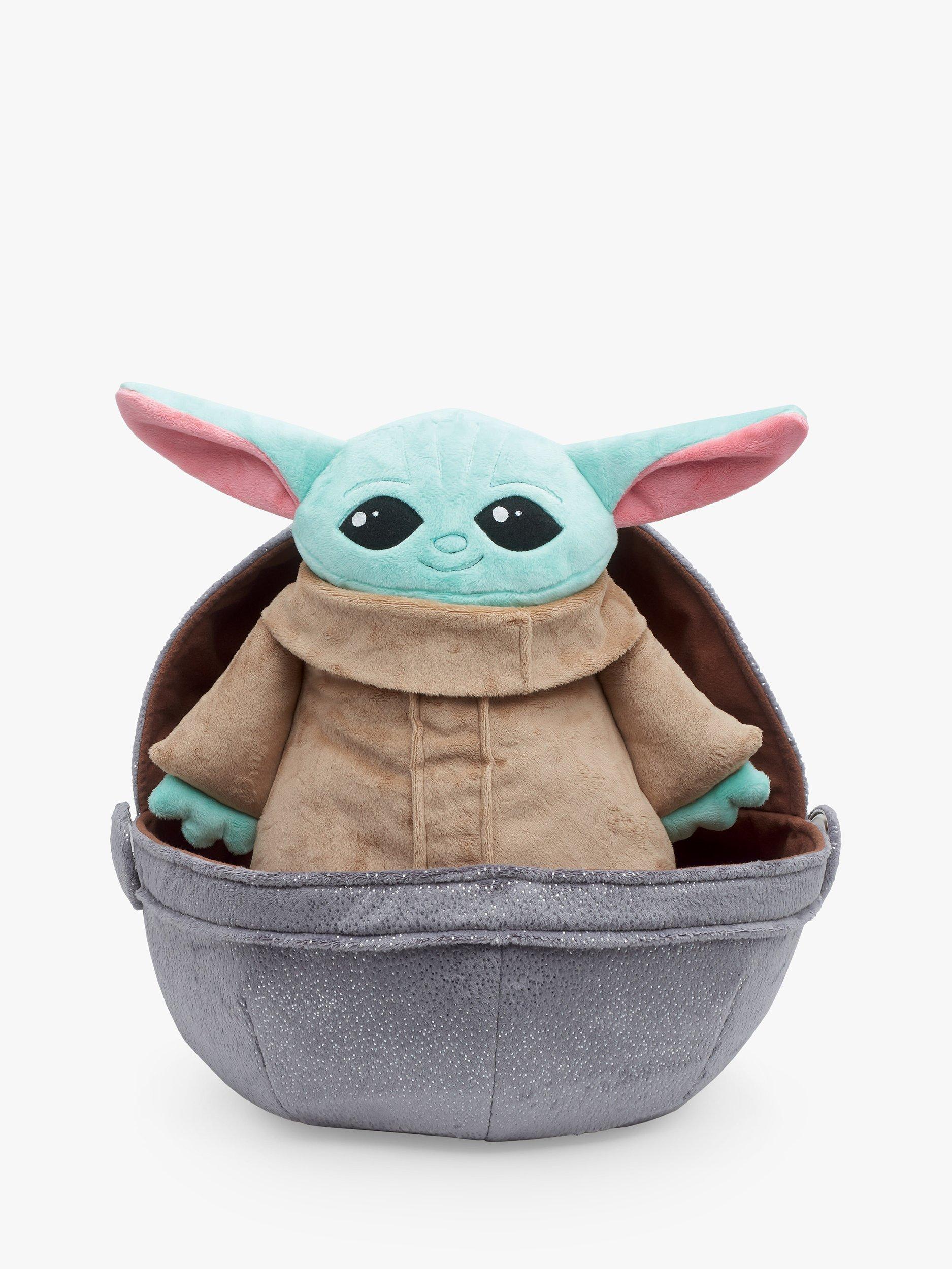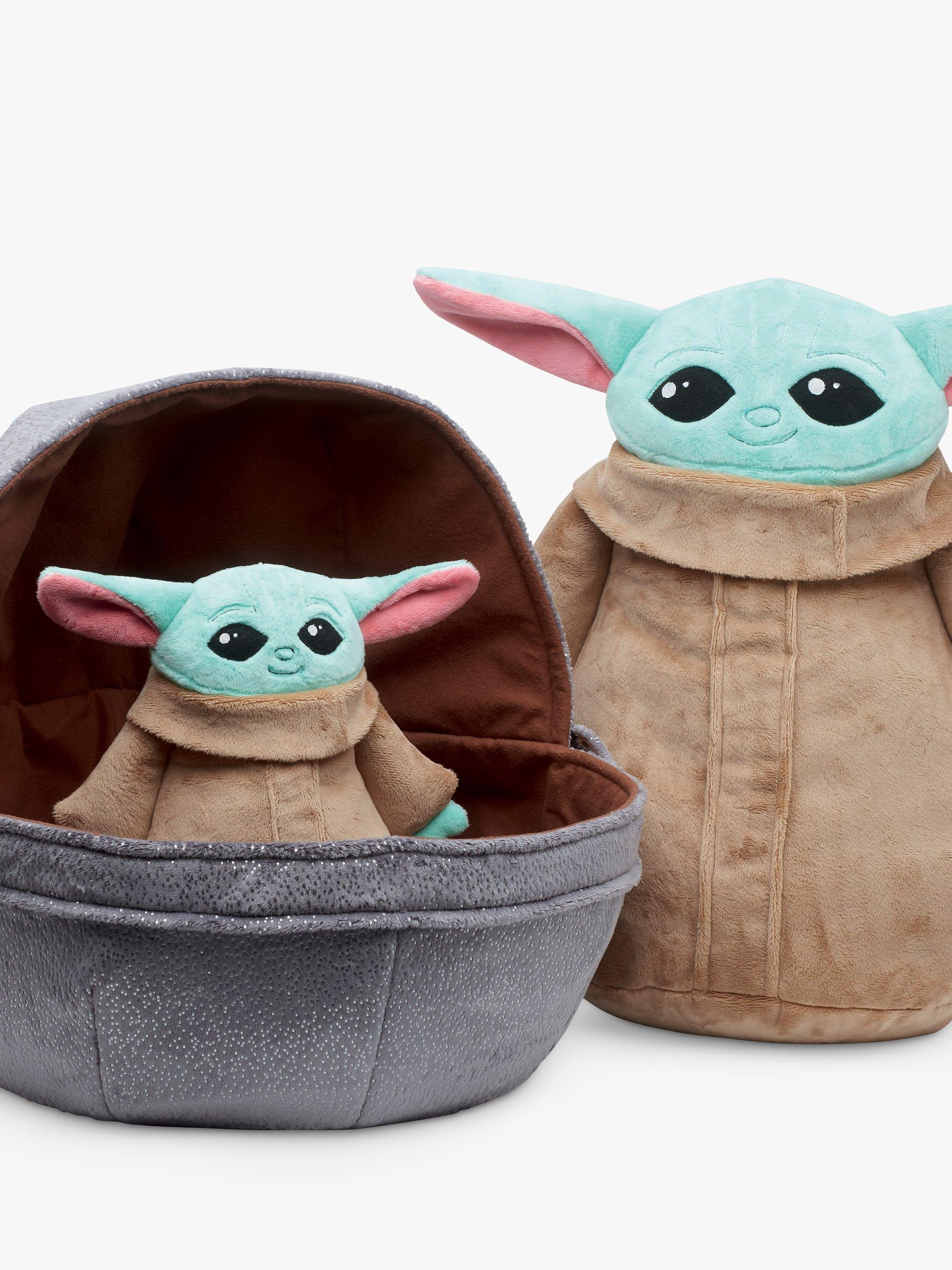 Cuddly soft Grogu in 21" (53cm) and 11"(28cm) heights have plush all-in-one body and head construction with stitched-in arms and 3D ears. With a round bottom and weighted with stuffing pellets, they stand alone or sit in a lined soft-sculpture space pram with covered button accents. Definitely precious Cargo!