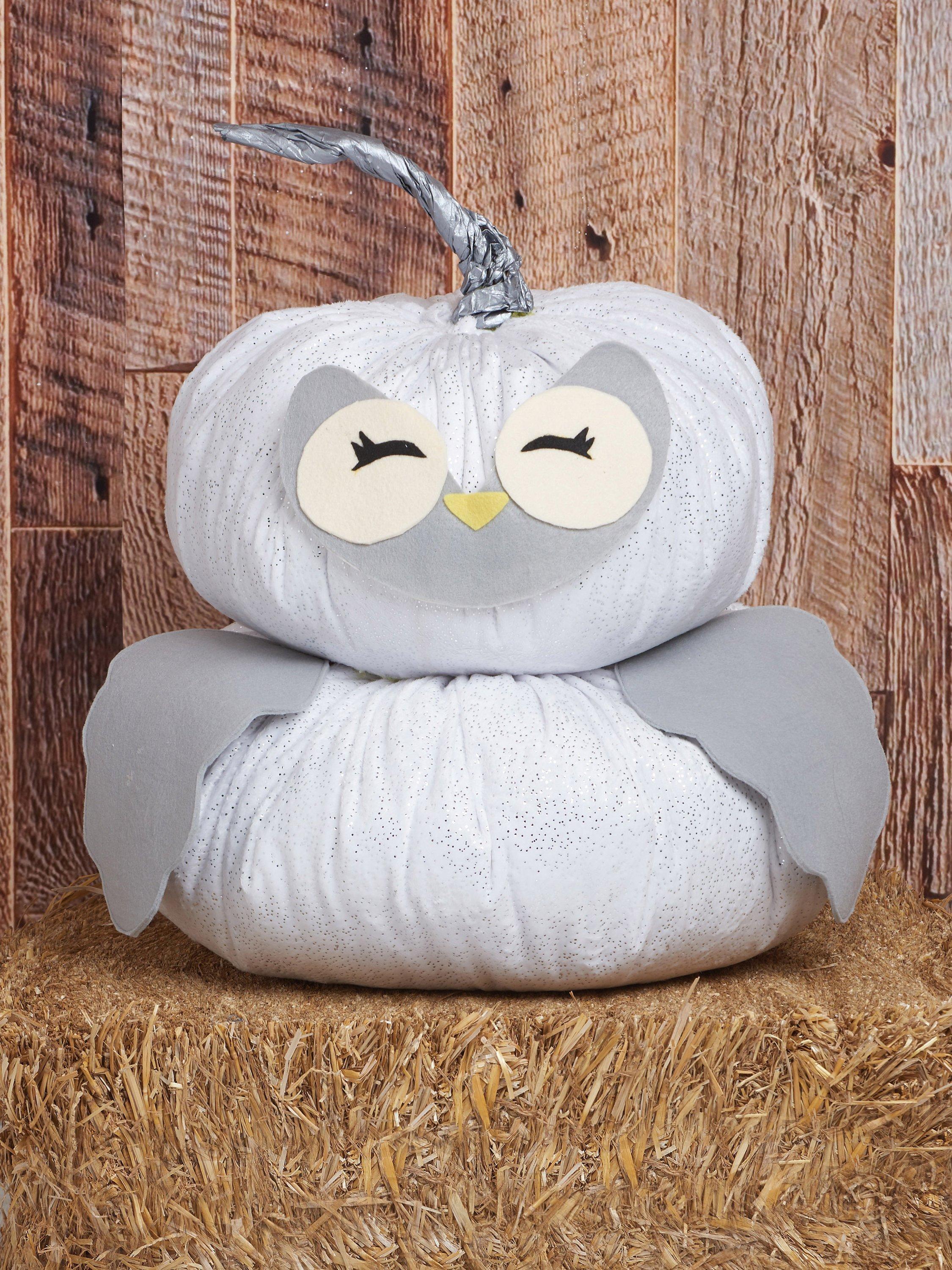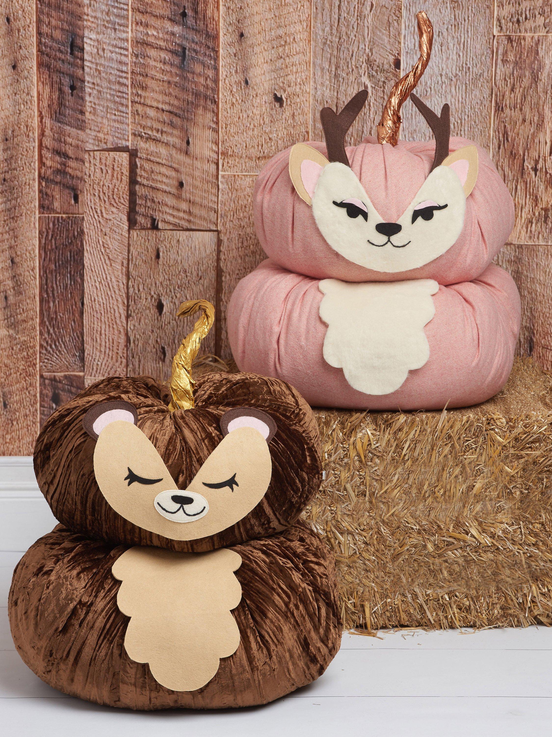 Hand or machine-gathered pumpkins are stacked to create the base for fox, bear, deer and owl. Features are cut from craft felt sheets and fused and glued in place. Stems crafted from twisted paper bags can be painted or left as desired.