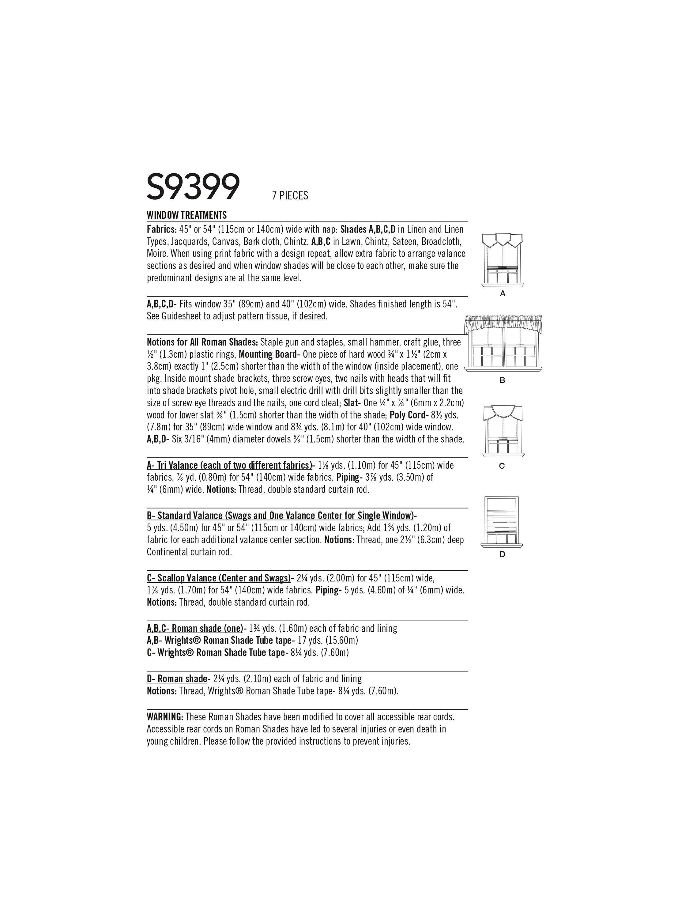 SimplicityRoman Blinds and Valances Sewing Pattern, S9399, OS