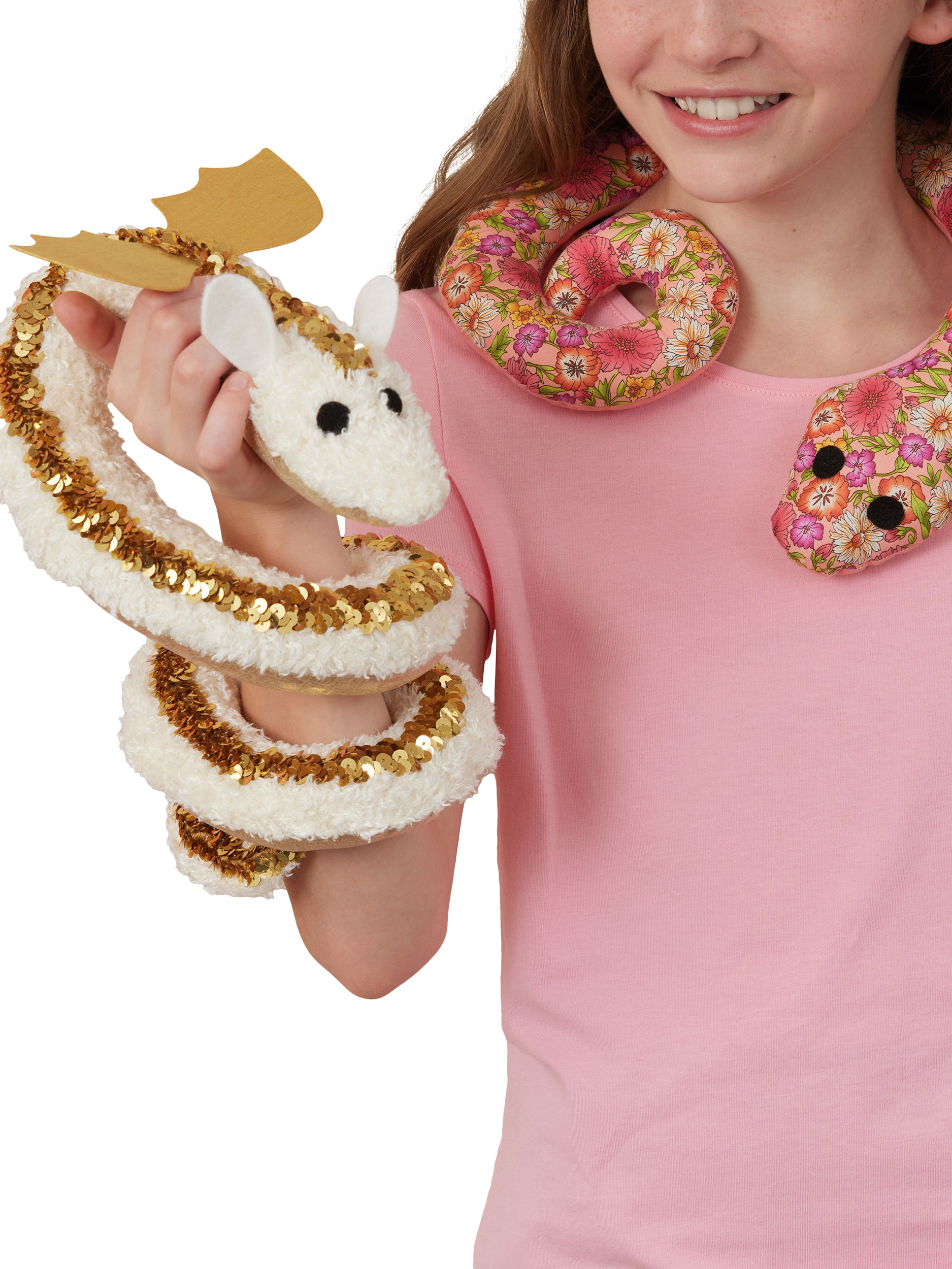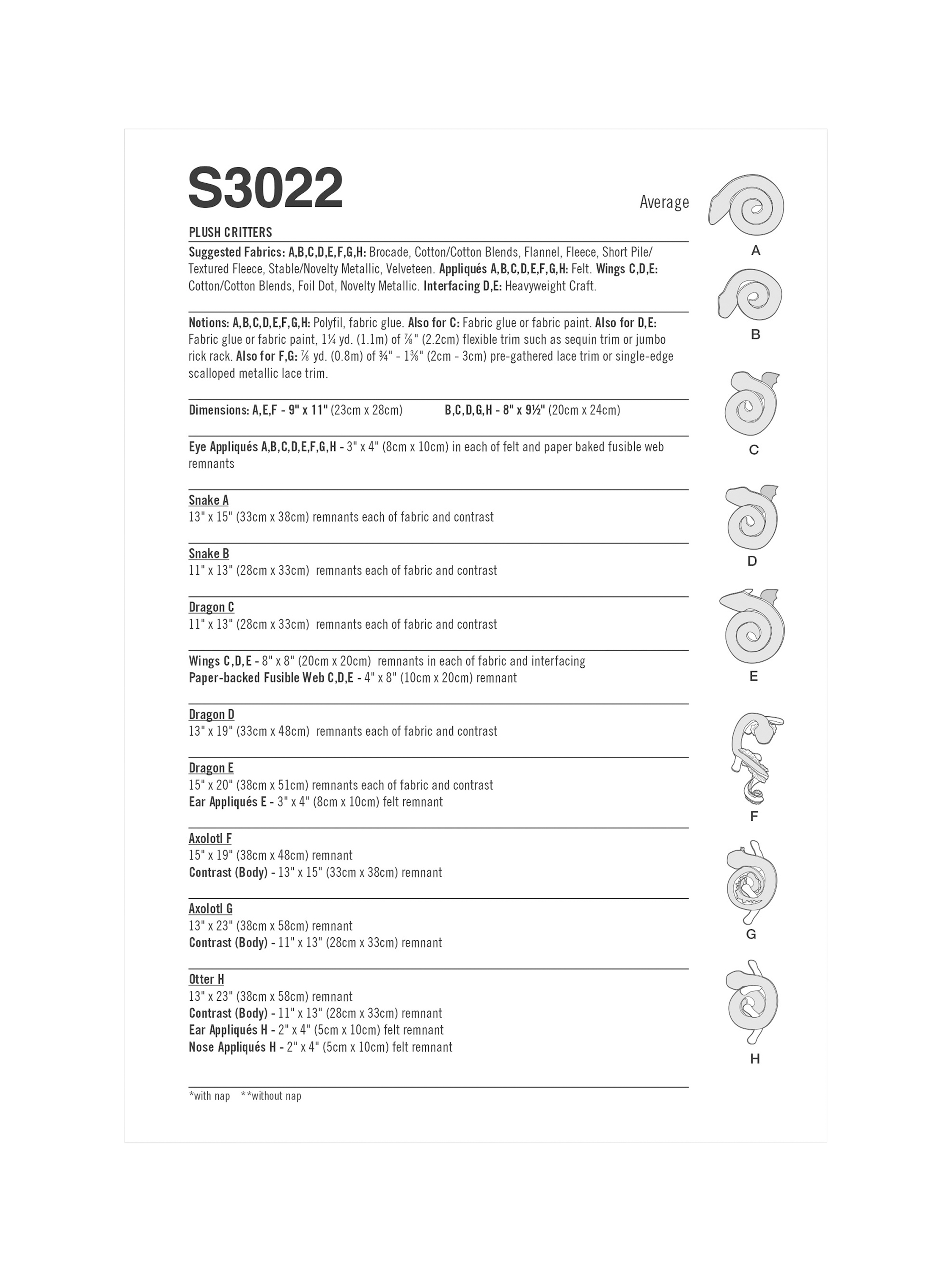 Easy, fun snake, axolotl and dragon in 2 sizes. Otter is one size. The coil body wraps around your arm. Get creative with trims!