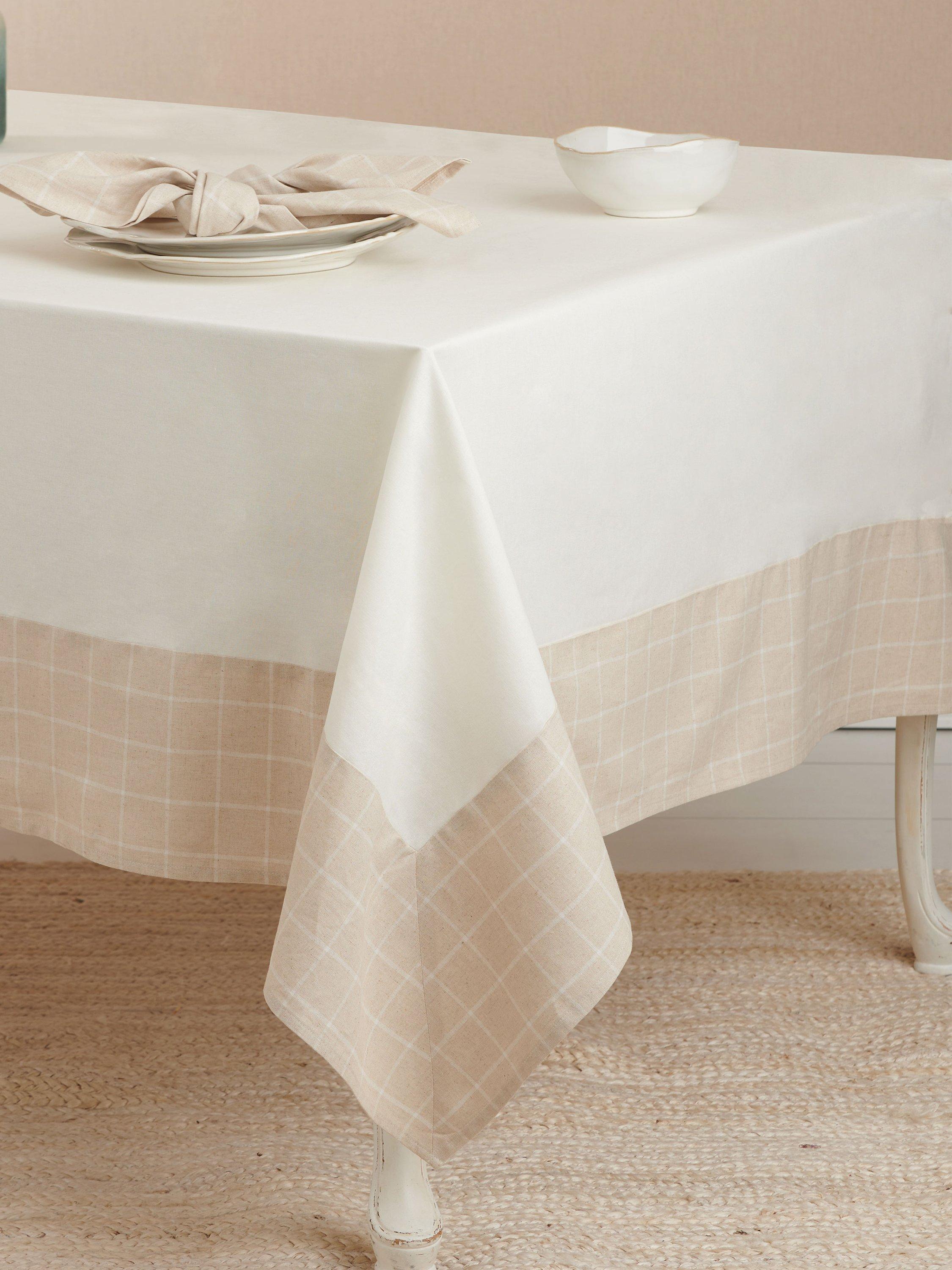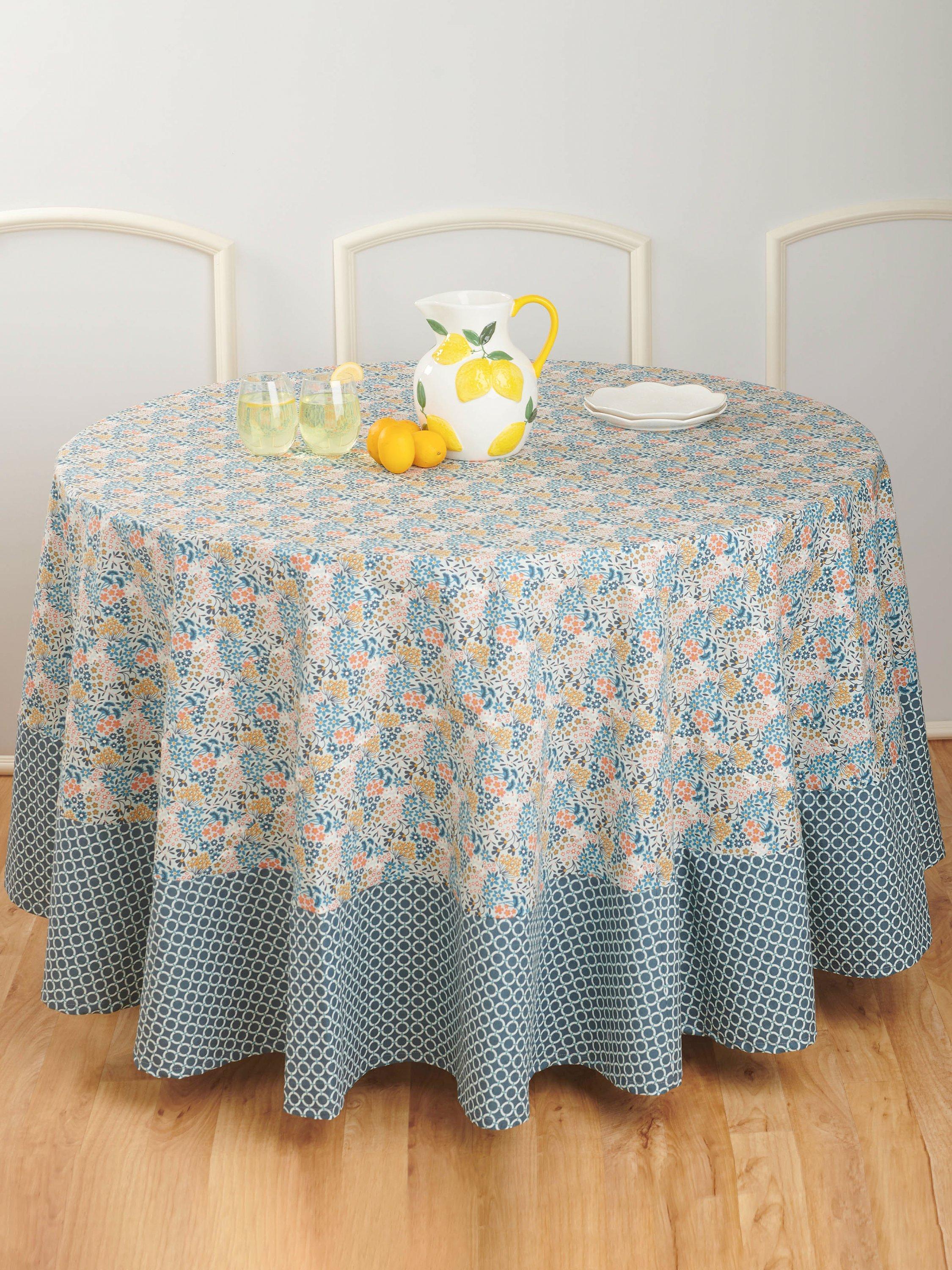 Rectangular table cloth and round table topper have contrast fabric bands. Round table topper has hem ruffle.