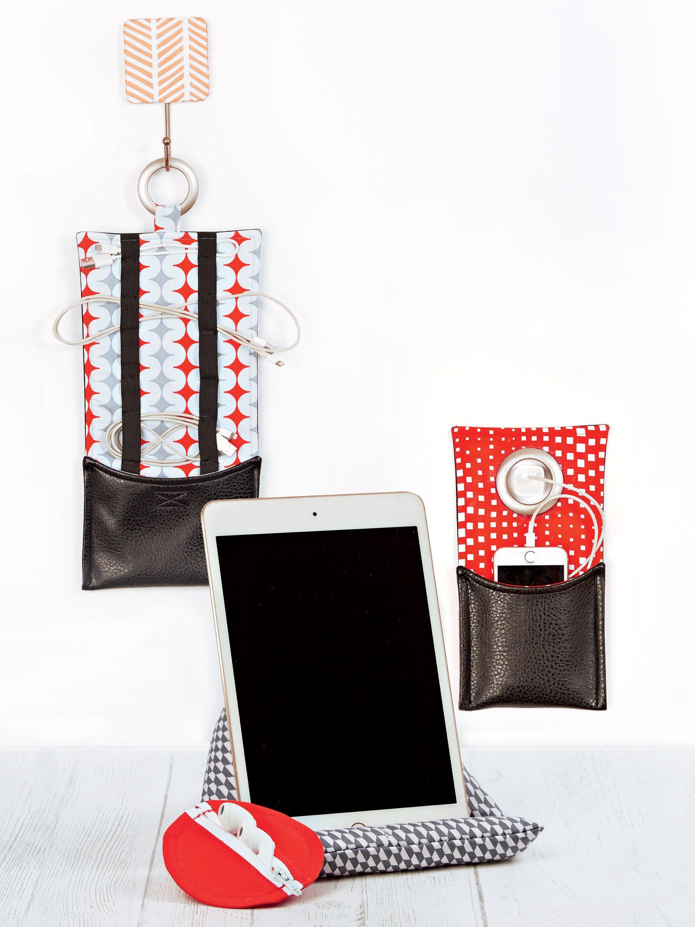 Stuffed tablet stand, hanging cable caddy, plug-in phone charging station and compact earbud holder offer stylish solutions for your tech.