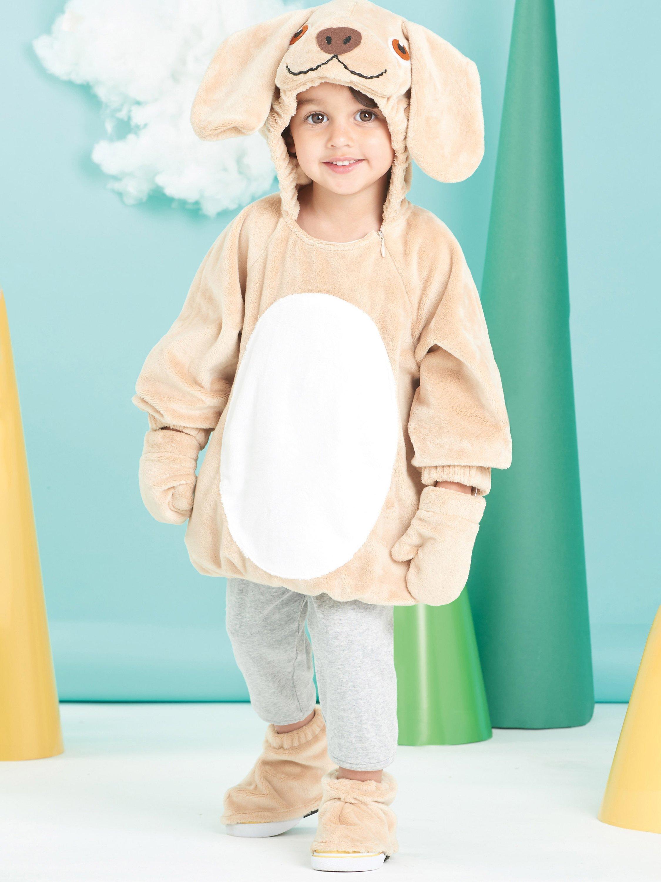 The costume has a front hook and loop fastener opening. The hood has an applique face with stuffed muzzle. Includes mittens and shoe covers (without sole).