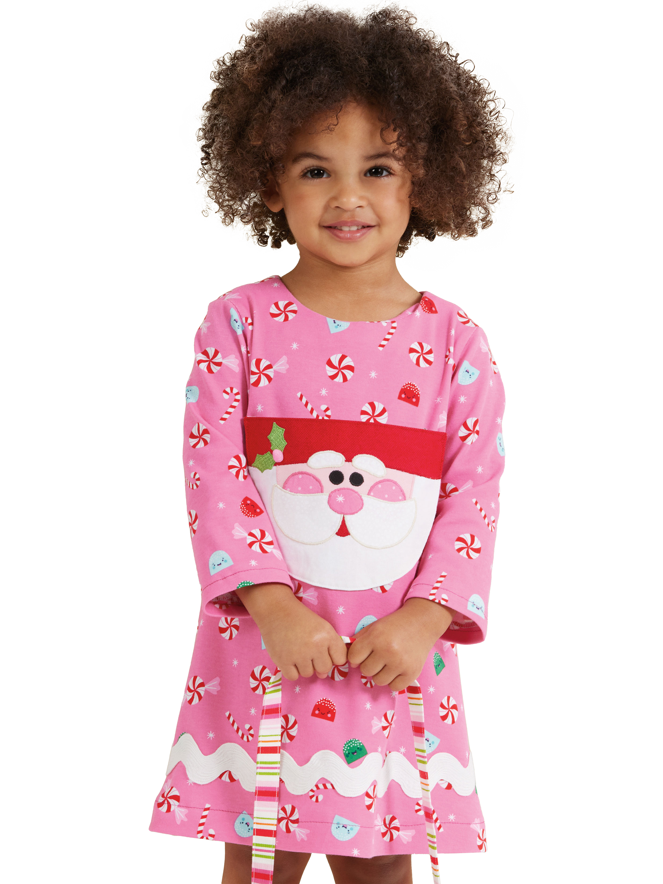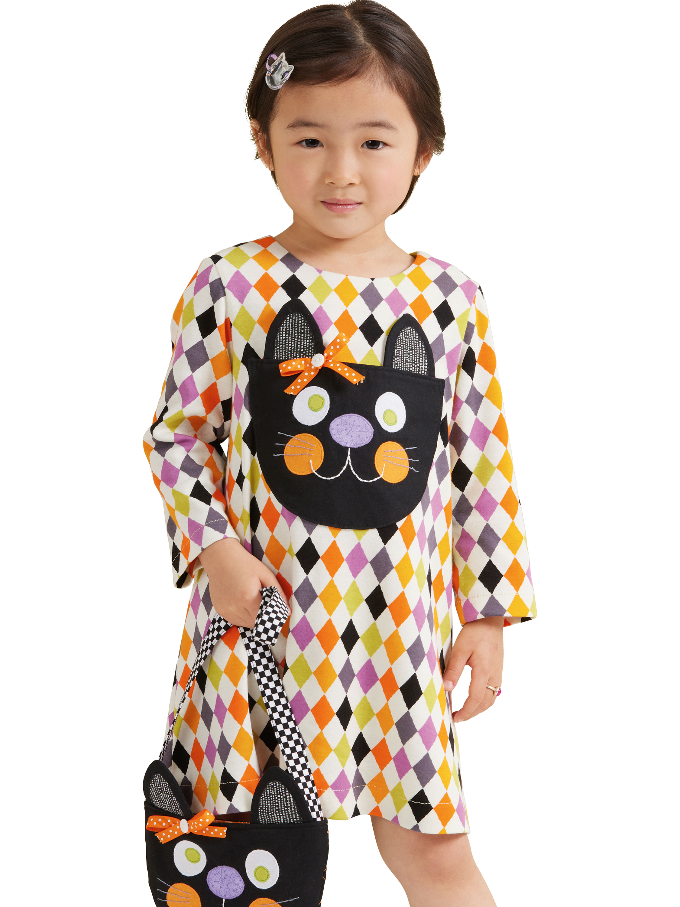Easy A-line dresses, long sleeve, short sleeve and sleeveless have a loop and button back closure. Add a fun, appliqued pocket on the dress front and make a matching appliqued bag for little treasures.