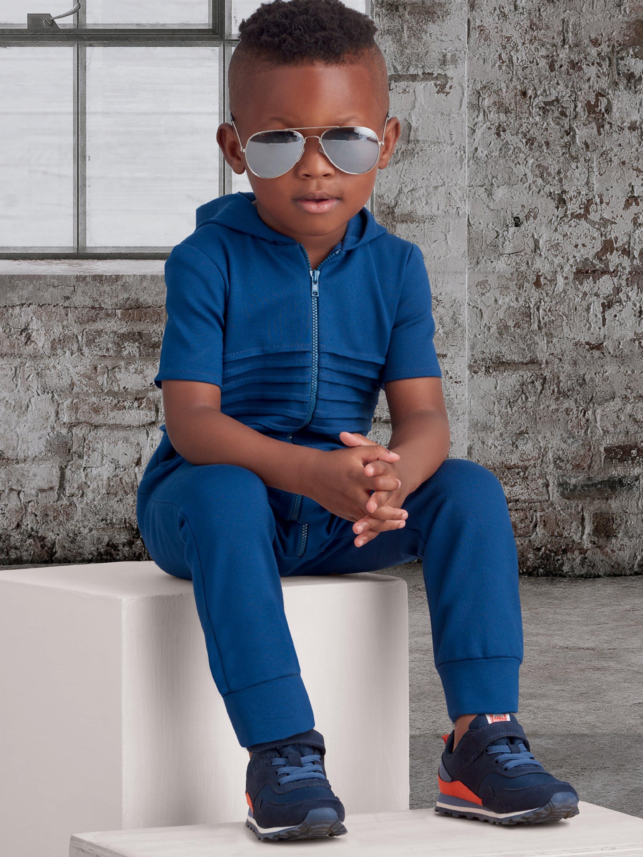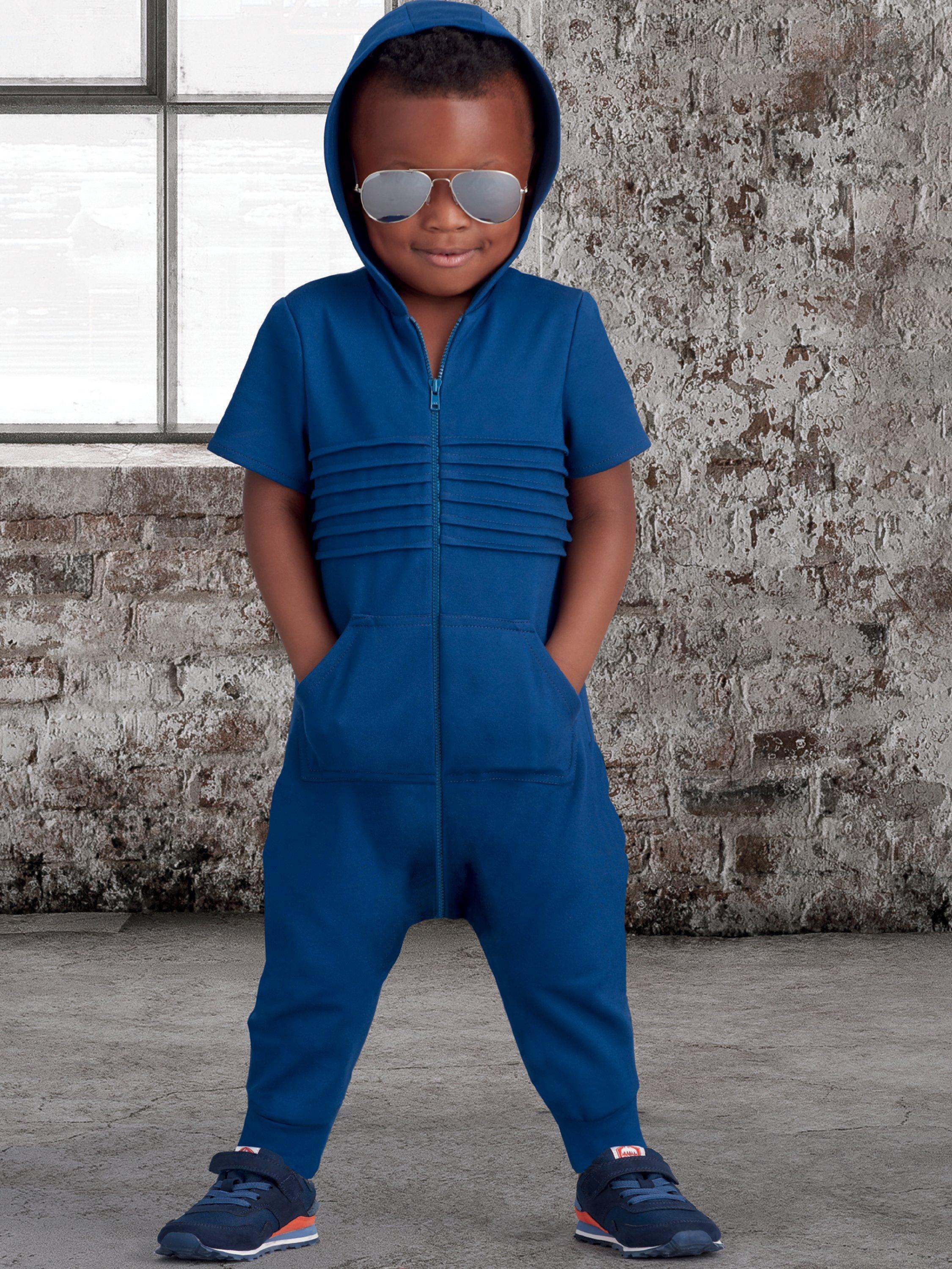 Toddler's jumpsuit is pull-on with front zip closure. Front pockets and seam detail. Short or long sleeves. Sleeveless option. Designed for stretch knits only.