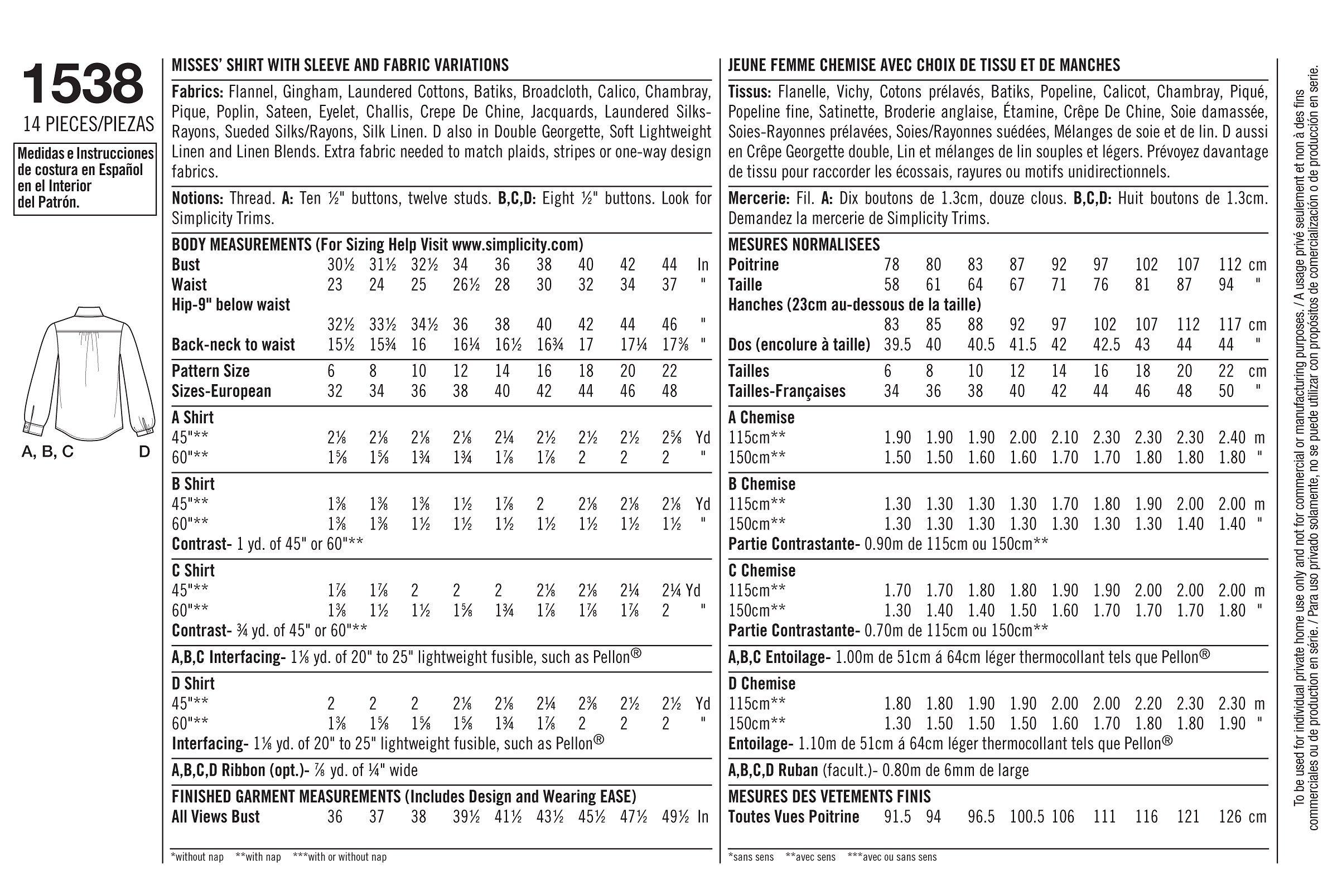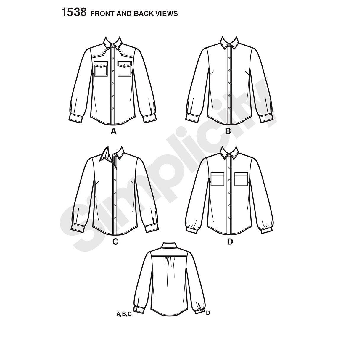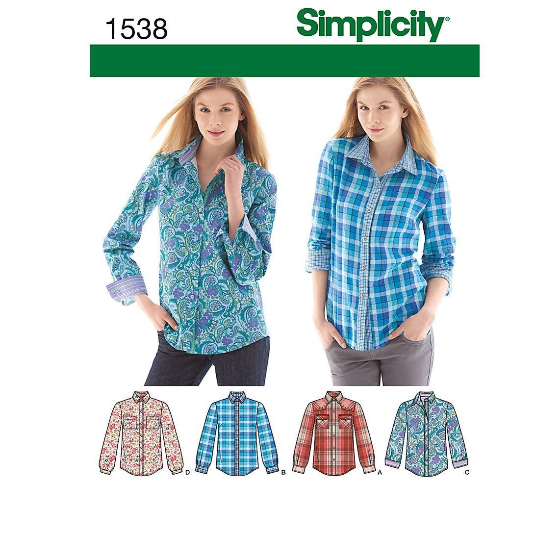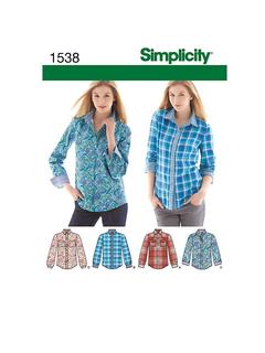 Simplicity sewing pattern for making a women's shirt with trim and fabric variations. Update a classic shirt with contrast fabric collar, inside yoke, cuff and placket or add a yoke with stud trim and bias pockets. Sizes: 6-14.