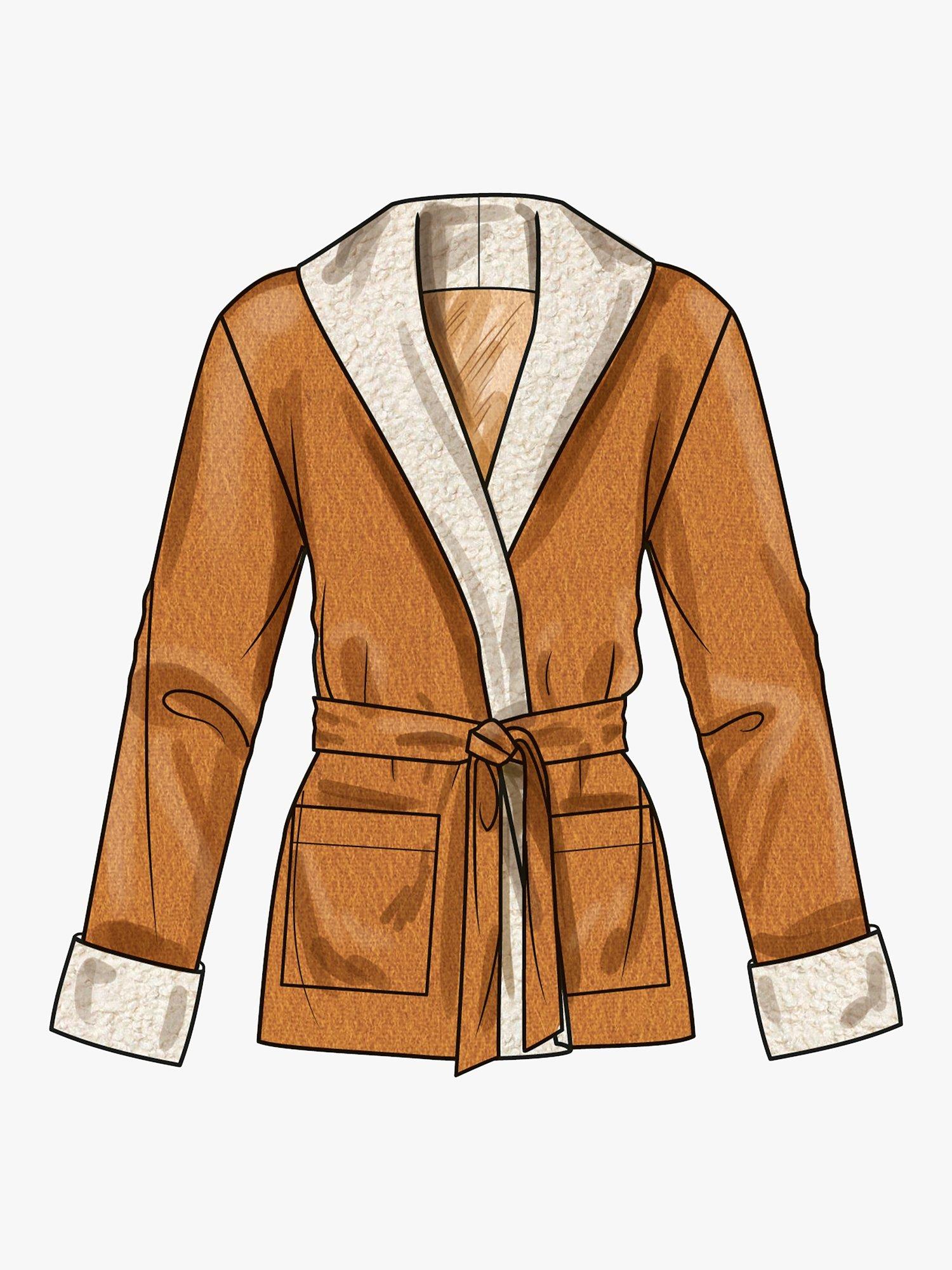 Easy-to-sew jacket and vest feature shawl collar, front button closure, and pockets. All jackets and vest have front and back lining. Views C and D are cropped.