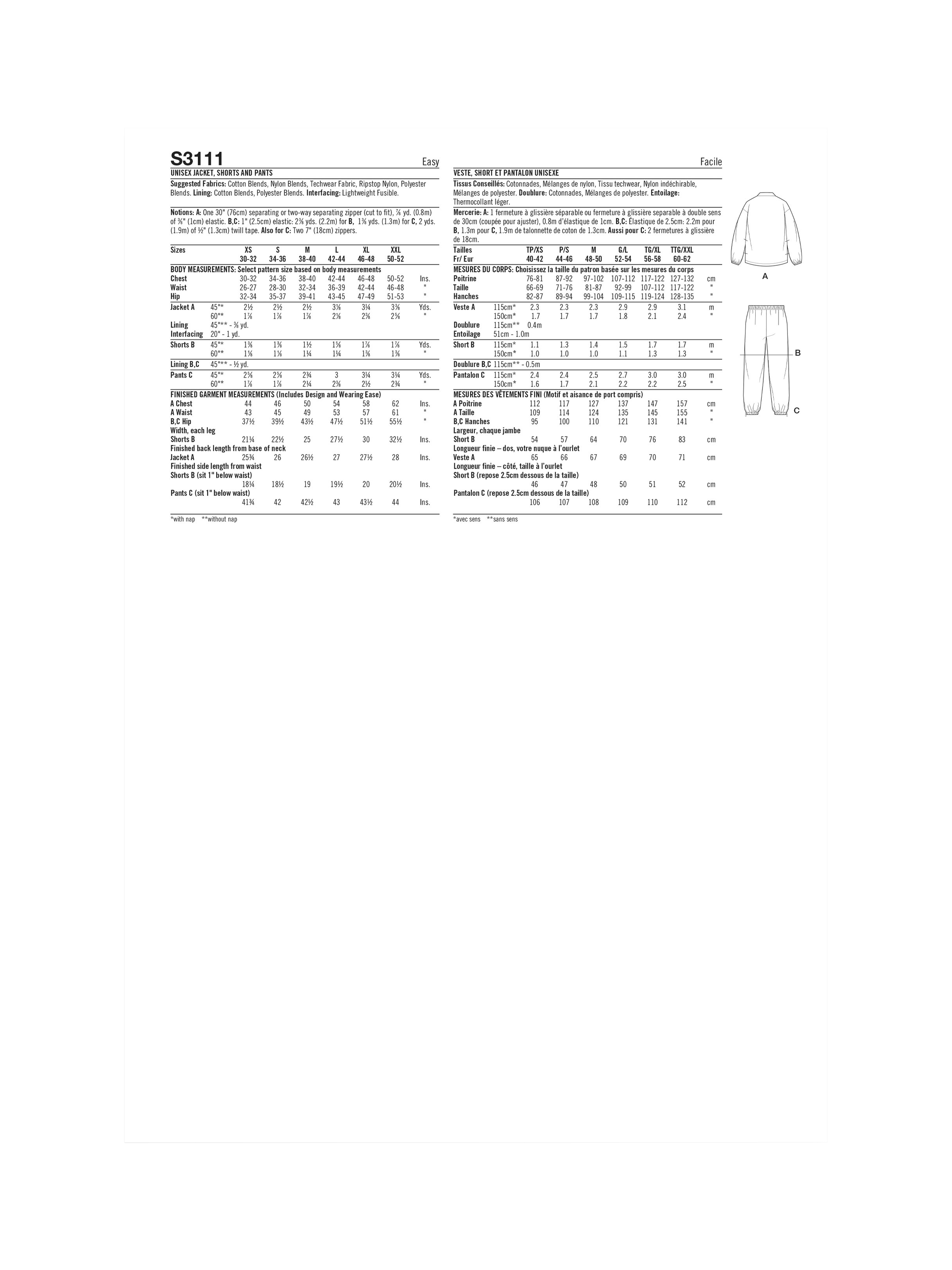 Unisex jacket with front zip opening has collar, dropped shoulders, elastic at cuffs and side seam pockets. Pull-on pants and shorts have elastic waistband, adjustable front ties, back darts, and side pockets. View C pants have side seam zip at ankles.