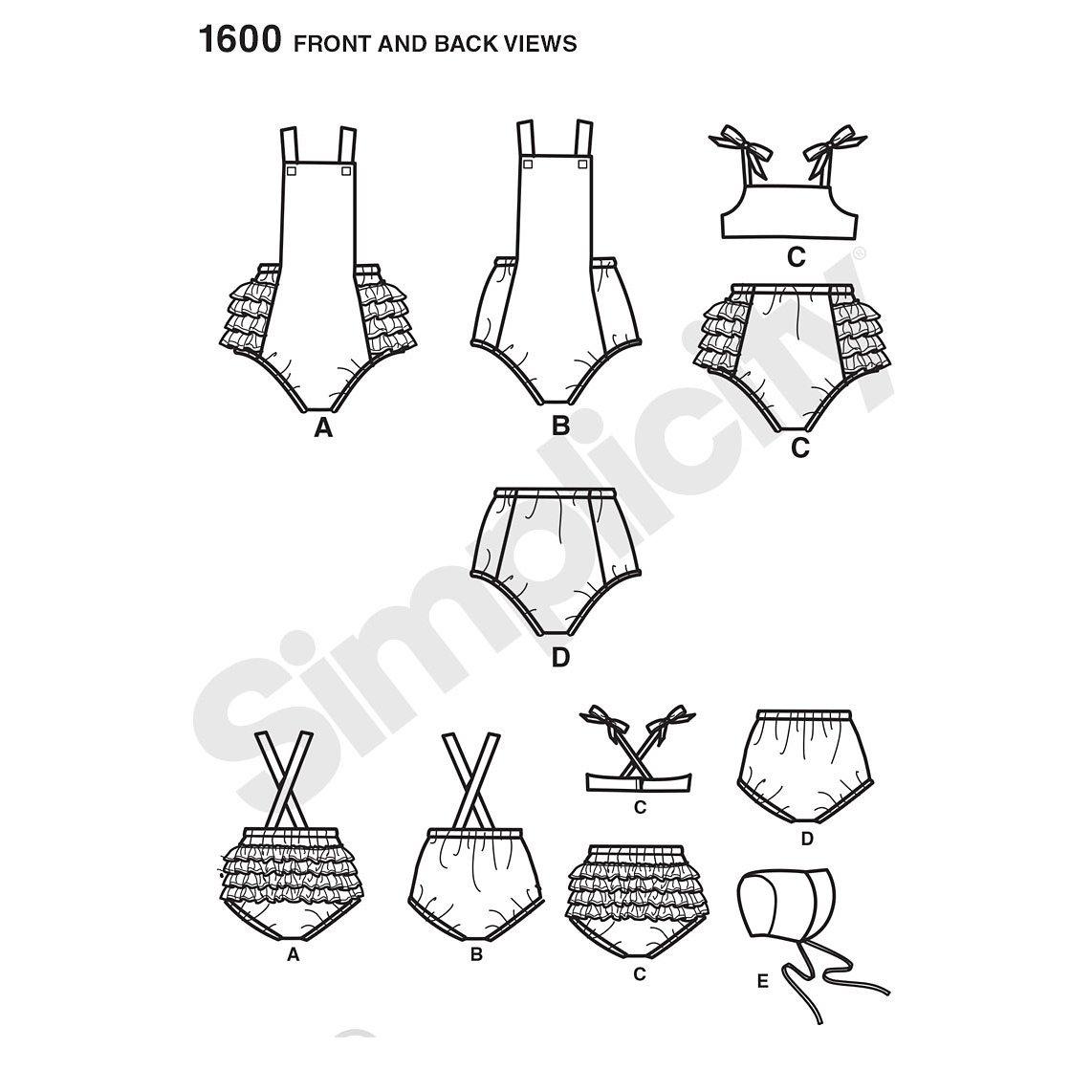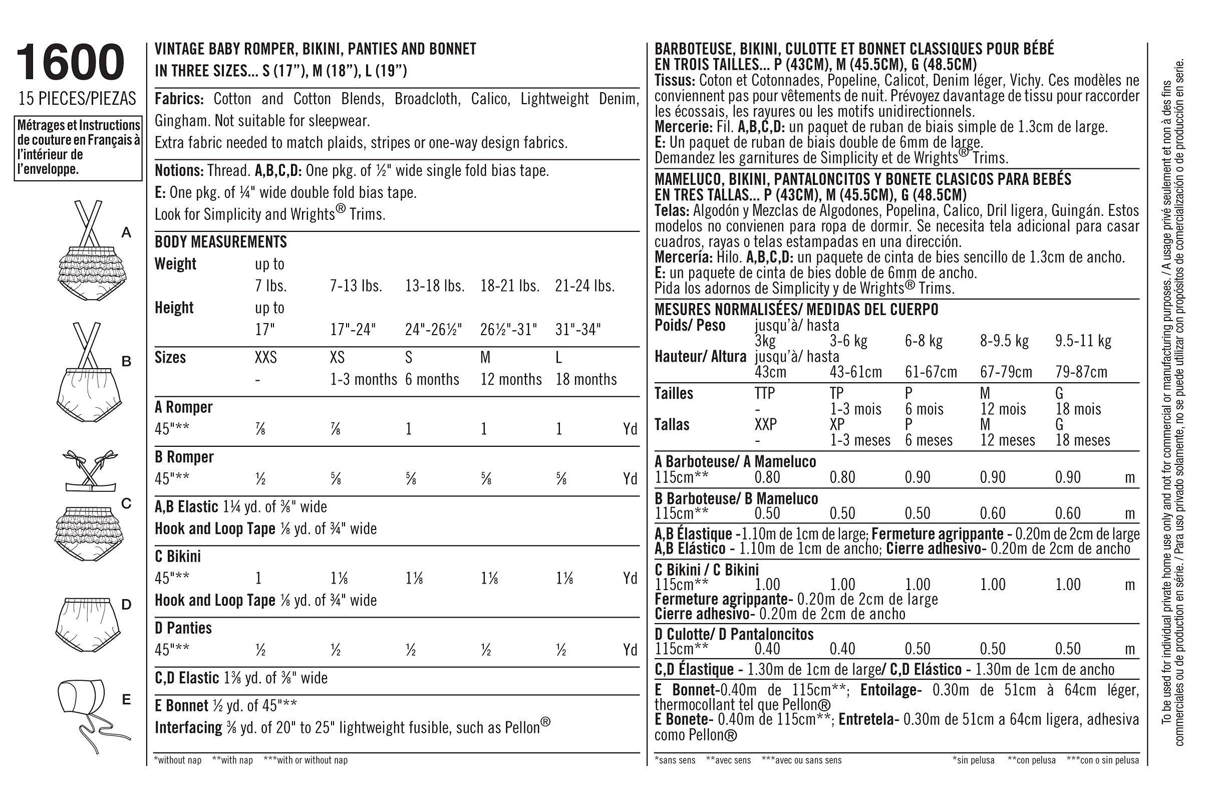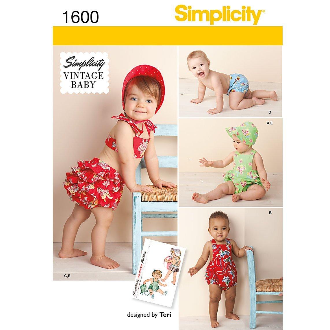 Simplicity archive sewing pattern for a vintage baby romper, bikini with back ruffles, panties and bonnet in three sizes S(17"), M(18"), L(19"). Sizes: XS (1-3 months), S (6 months), M (12 months), L (18 months).