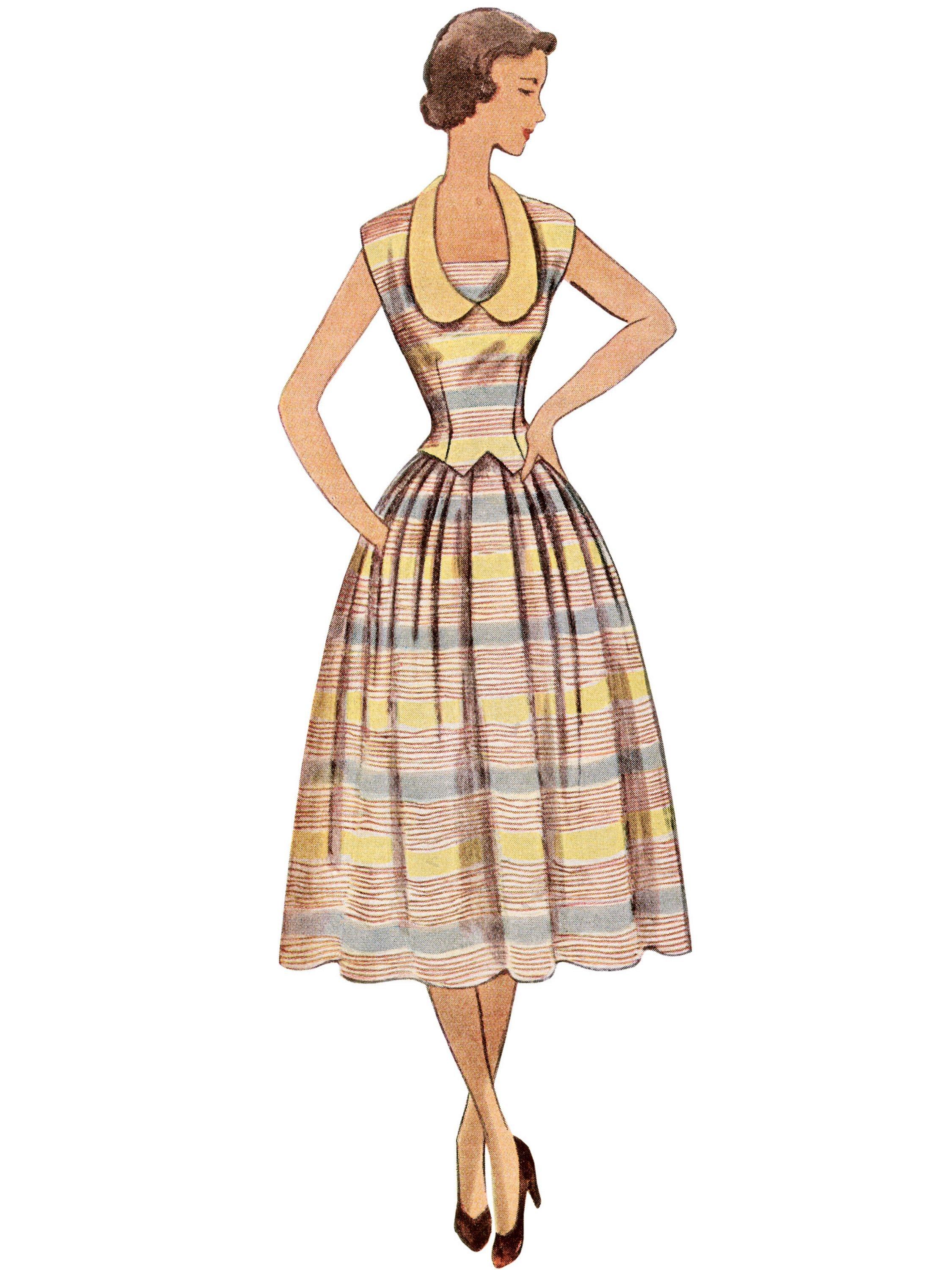 1950's two-piece dresses have collar, cuffs and dickie. Horseshoe neckline fashions the bodice. The full pleated skirt conceals two pockets. Dickie has ribbon bow tie and buttons. Dress B, which is featured in border striped fabric, has a vestee for modesty.
