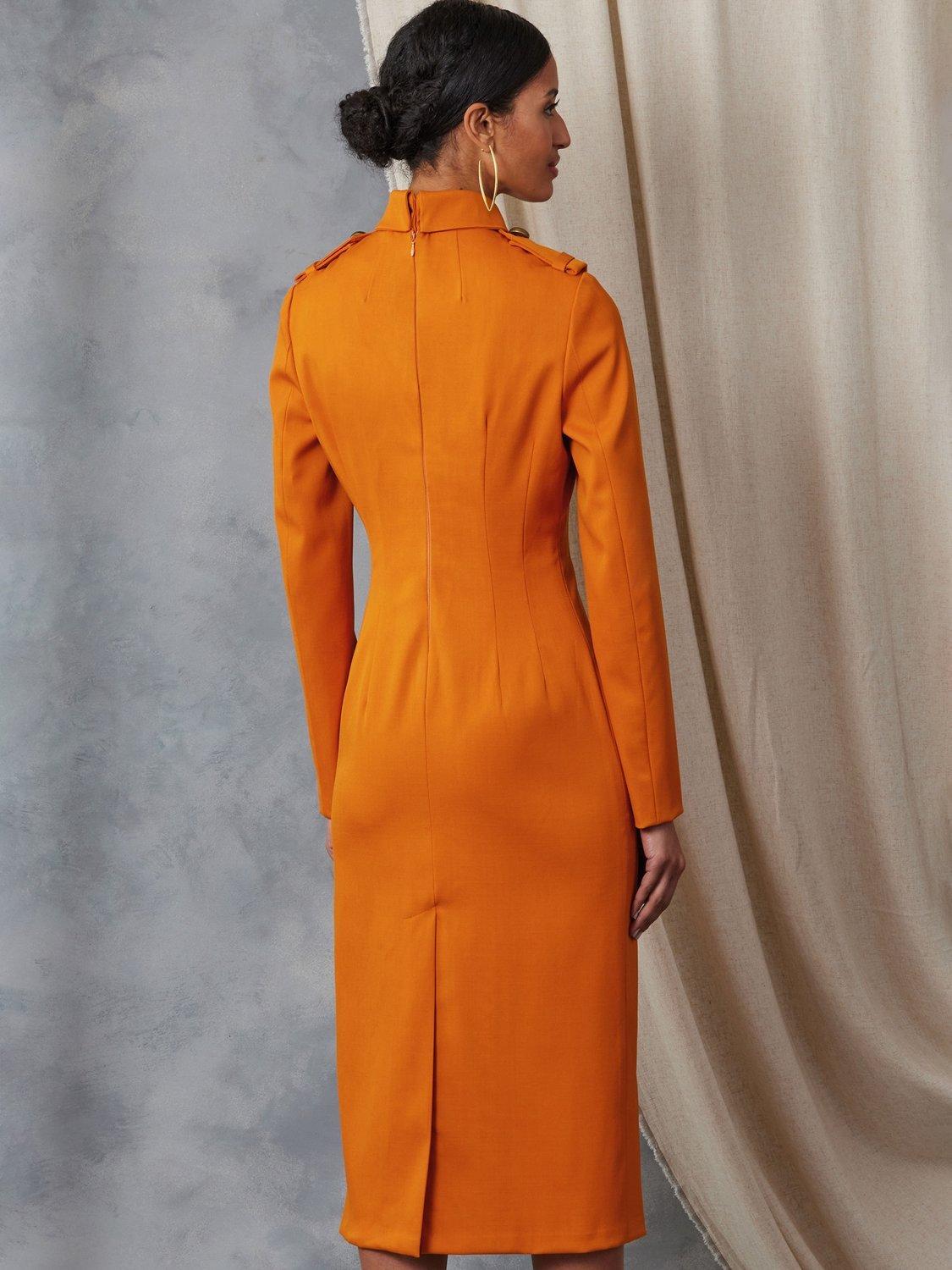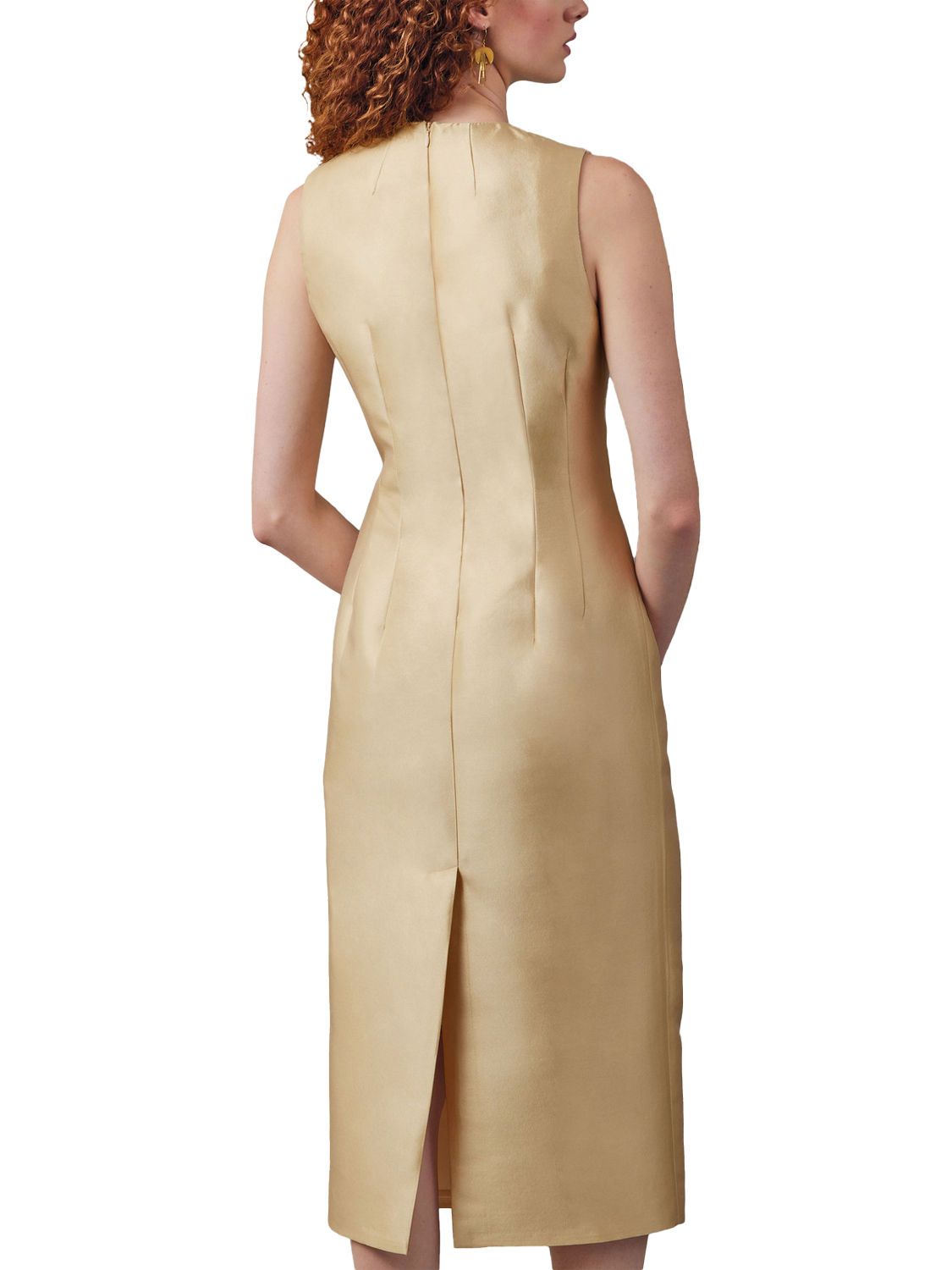 Sewing pattern for close-fitting, lined sheath dresses with waist and neckline dart shaping, flap detail, invisible back zipper with hook-and-eye closure and back vent.