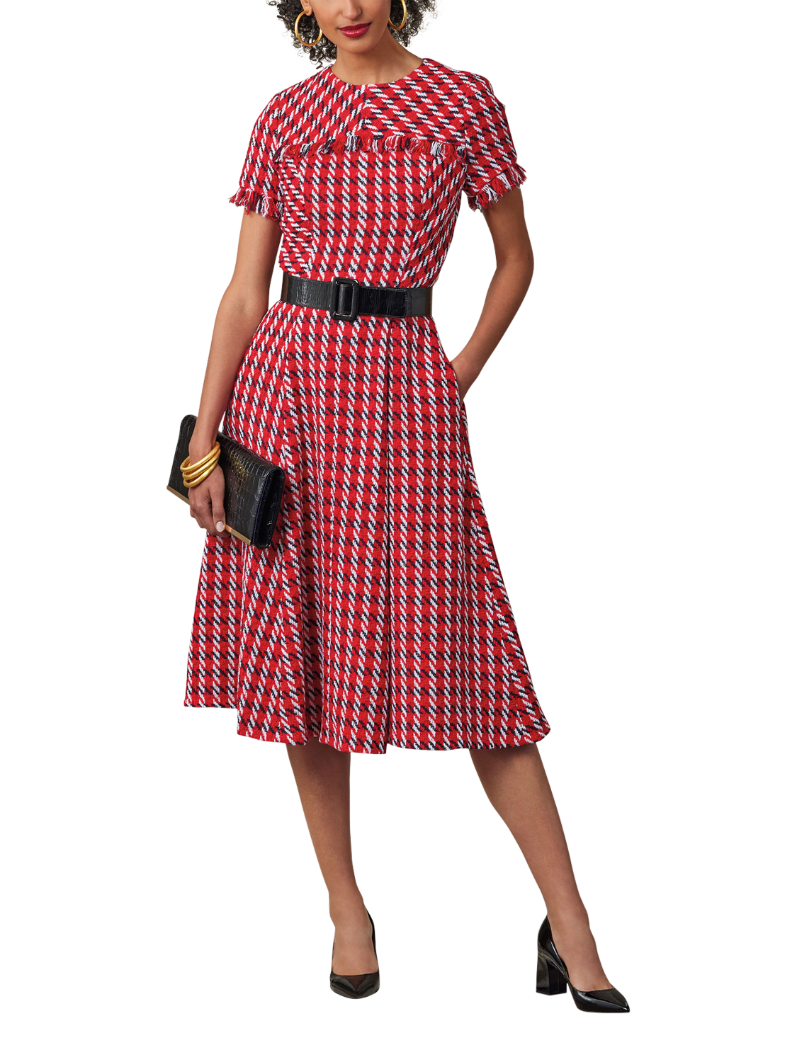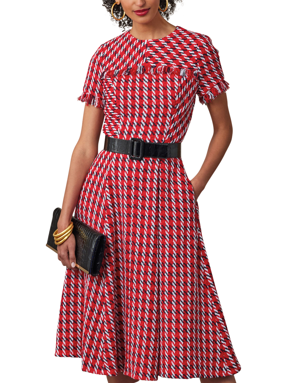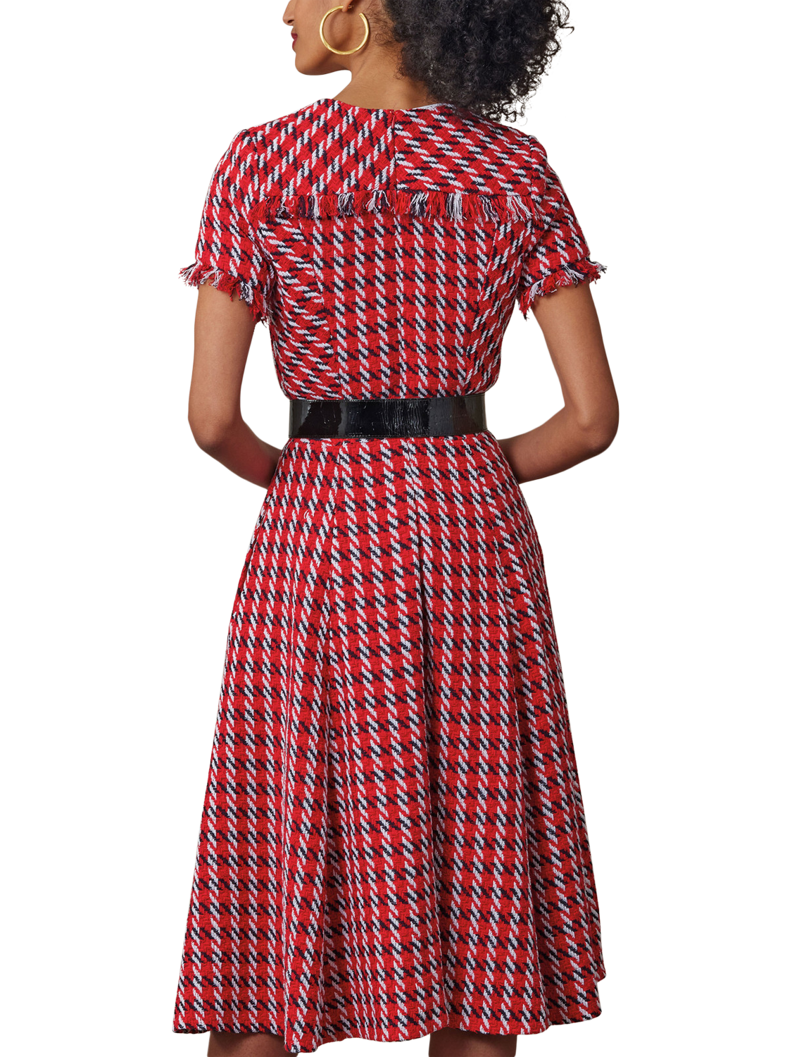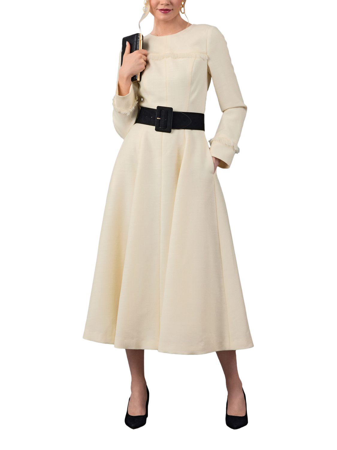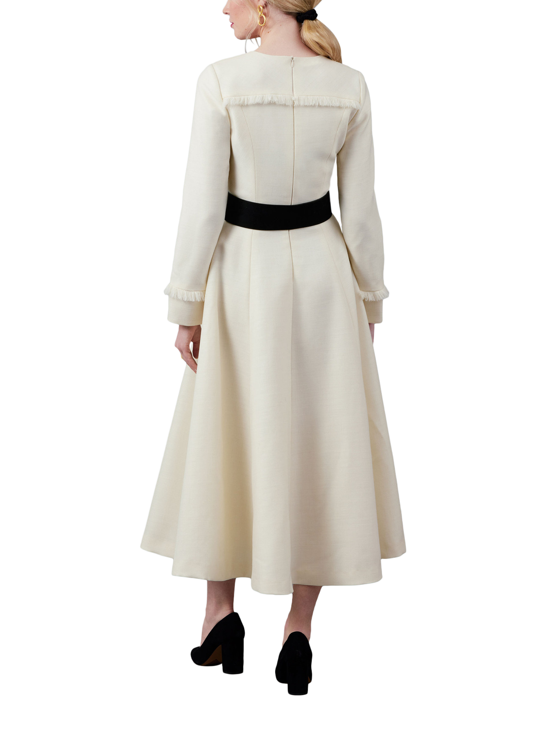 Sewing pattern for fit-and-flare dresses that are lined and underlined. Close-fitting through the bust and waist with set-in sleeves, a princess-seamed bodice with yoke detail, gored skirts, side seam pockets, an invisible back zipper with hook-and-eye closure and a self-fringe detail.