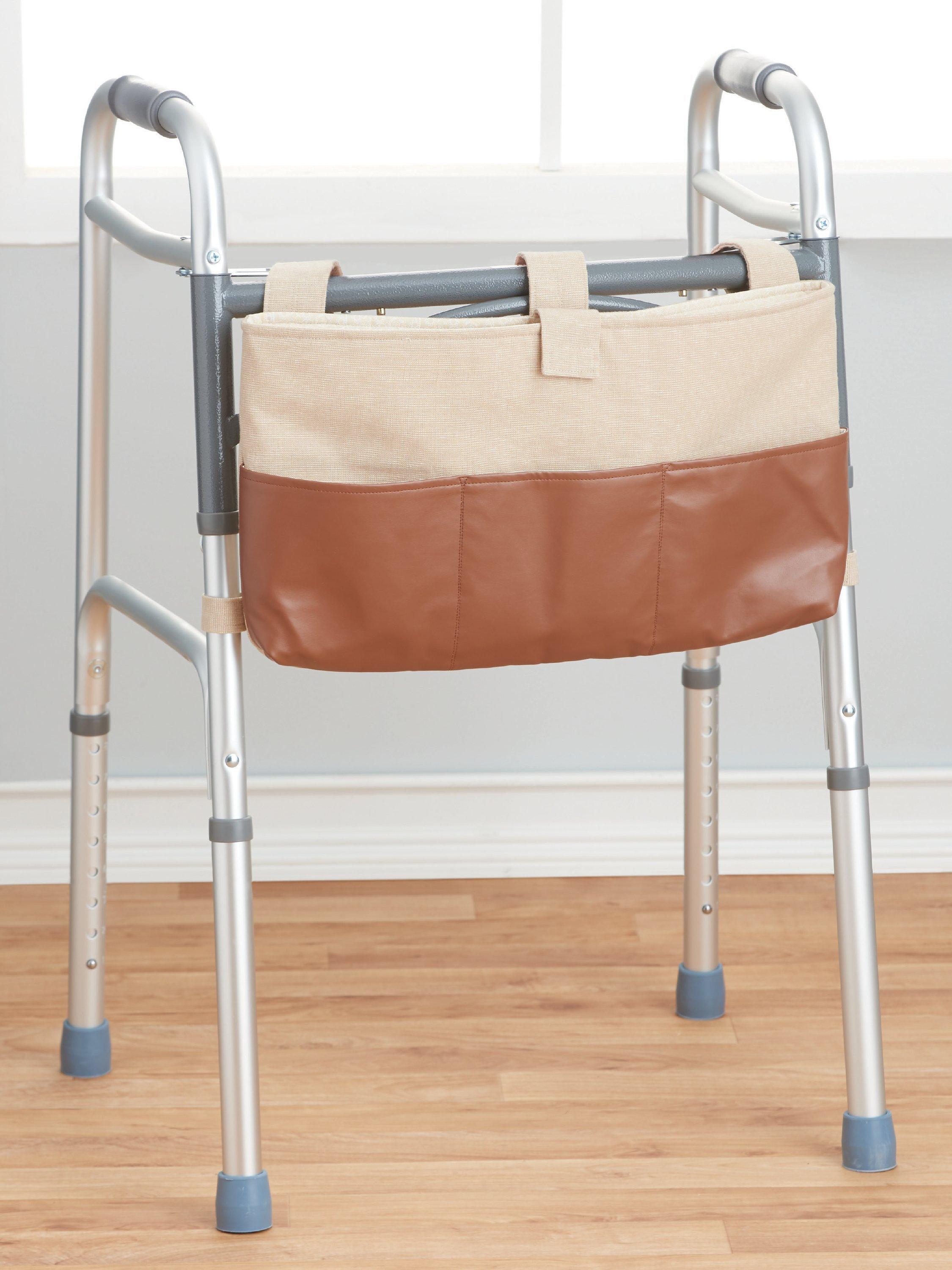 Lined, lightly padded walker bags fit most standard walkers with adjustable straps that secure with hook and loop tape. With front and back pockets, streamlined bags with flap and magnetic snap or tab closures have room to keep essentials organized.