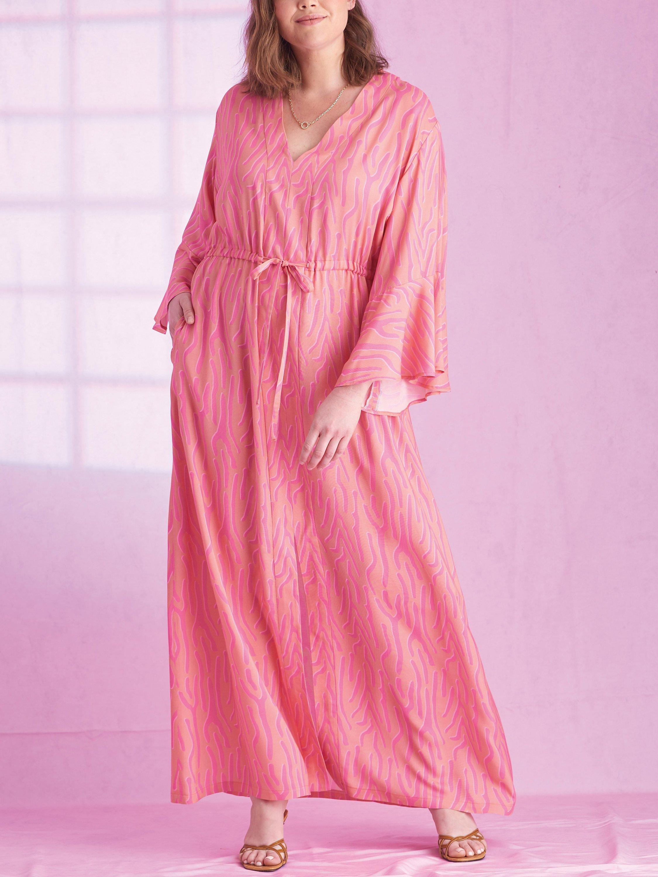 Caftans and wraps with front bands and self-ties have flared sleeves, with or without flounce.