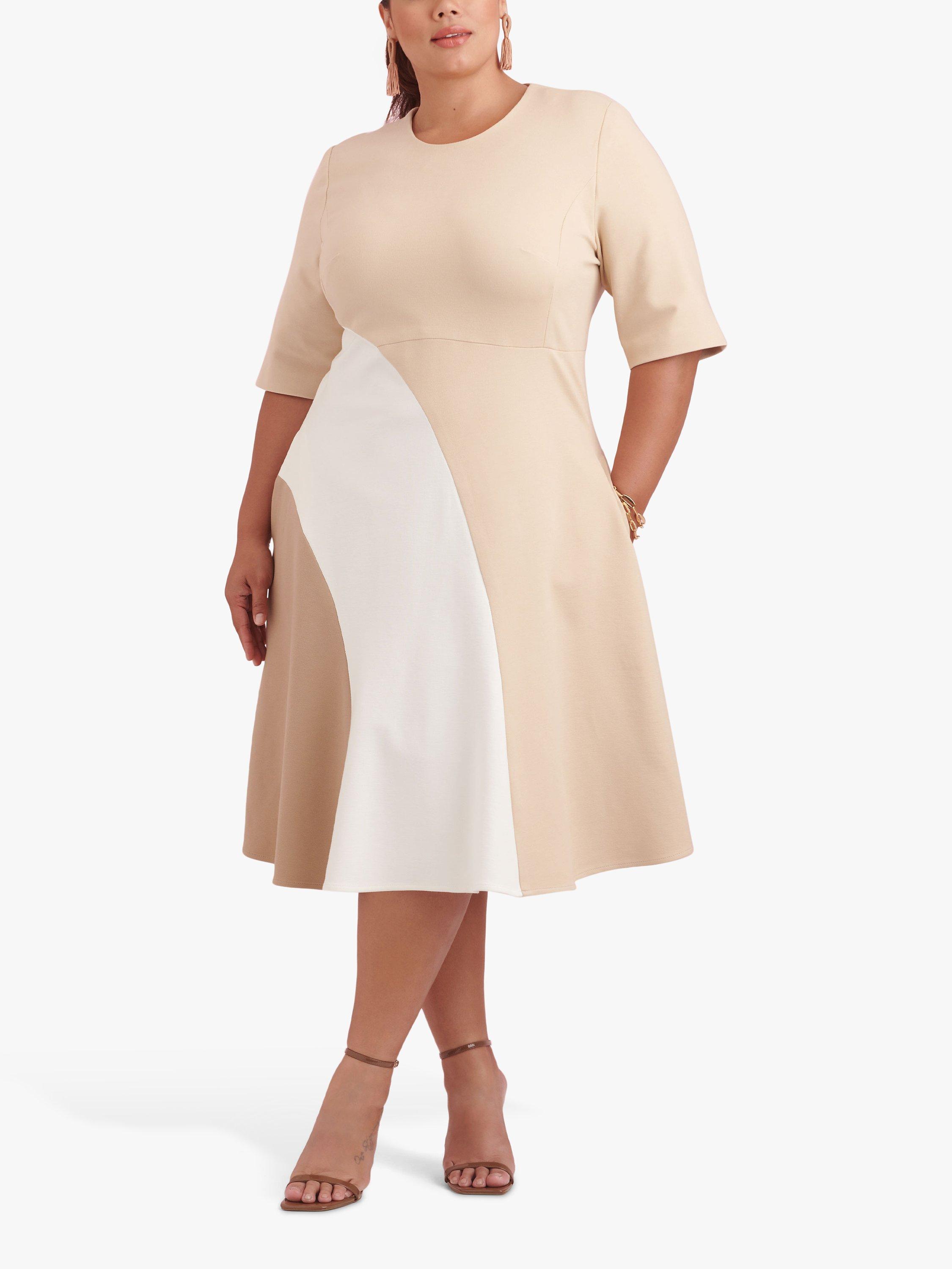 Fitted colour-blocked dress has bodice with princess seams and bust darts.