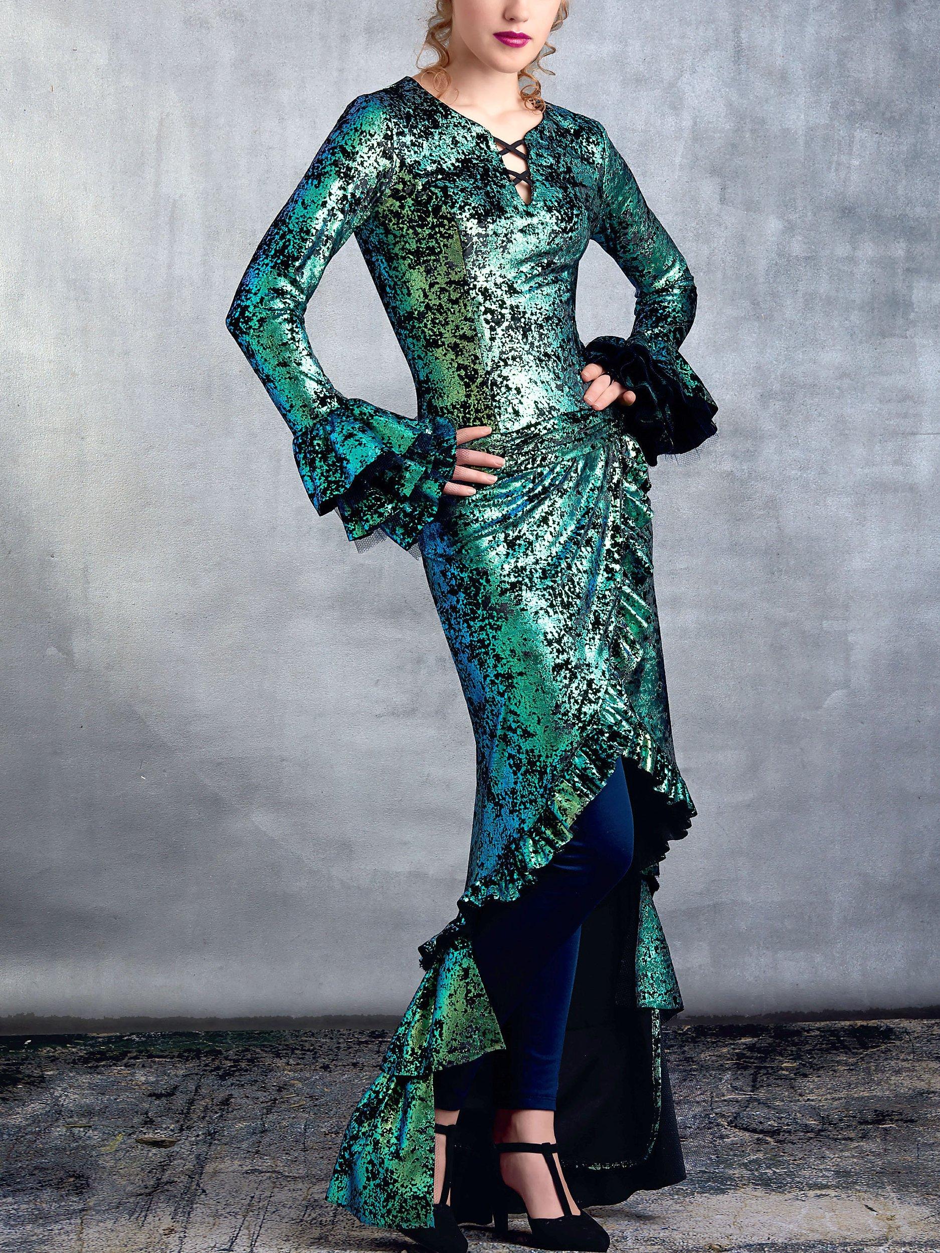 Following this pattern you can sew close-fitting dresses with princess-seamed bodices. Skirts with varying style and trim options, pull-on leggings and a shaped cape.