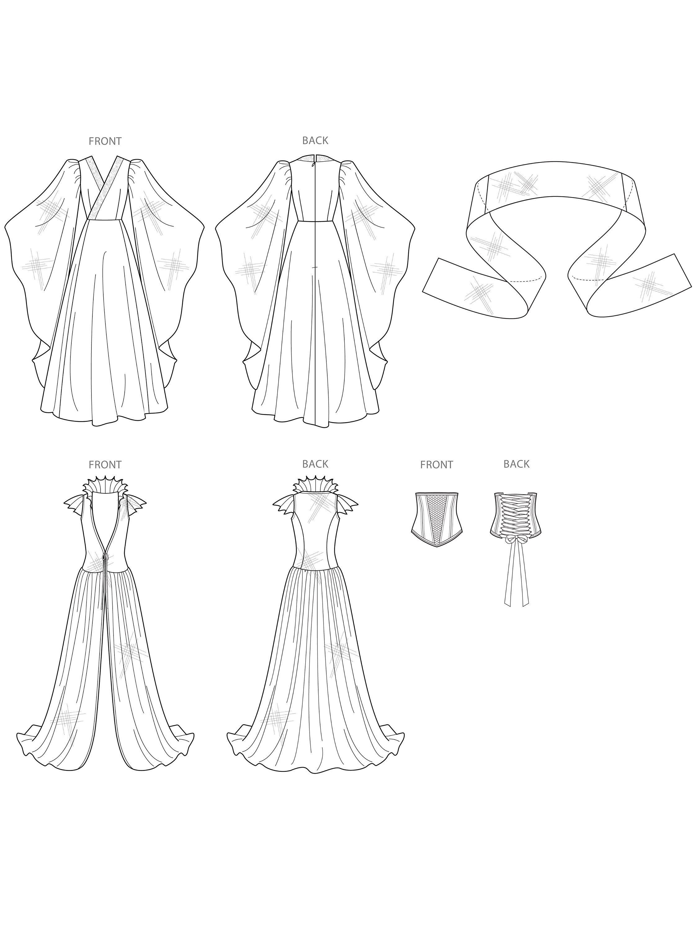 Following this pattern you can sew a full-sleeved and long, waisted dress with a wrap-front bodice and a sleeveless coat with a full skirt and dramatic stand collar.