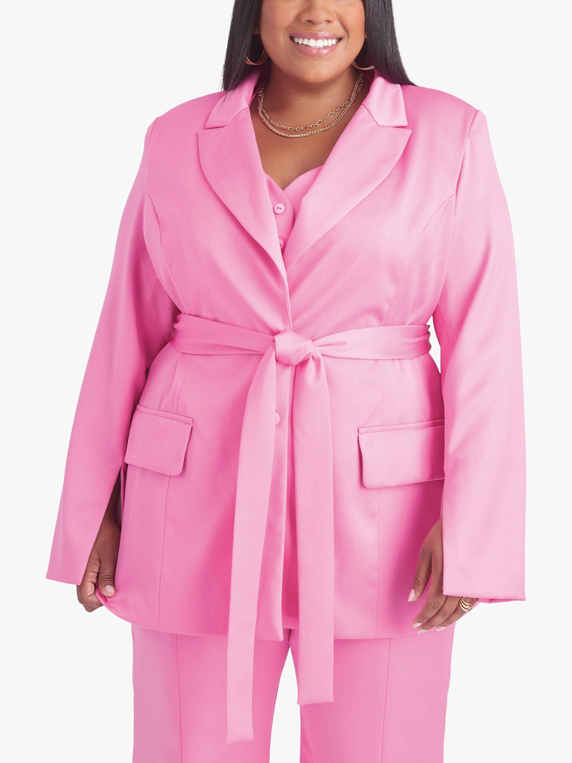 Jacket features a belt, shoulder pads, lining, front flap pockets, and front buttons. View A has slit on sleeves. View B has contrast collar, lapel, tie, and pocket flaps.
