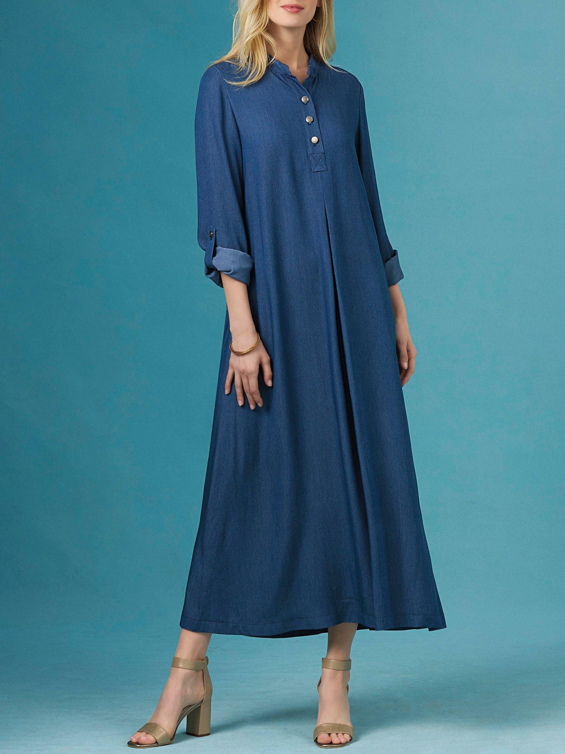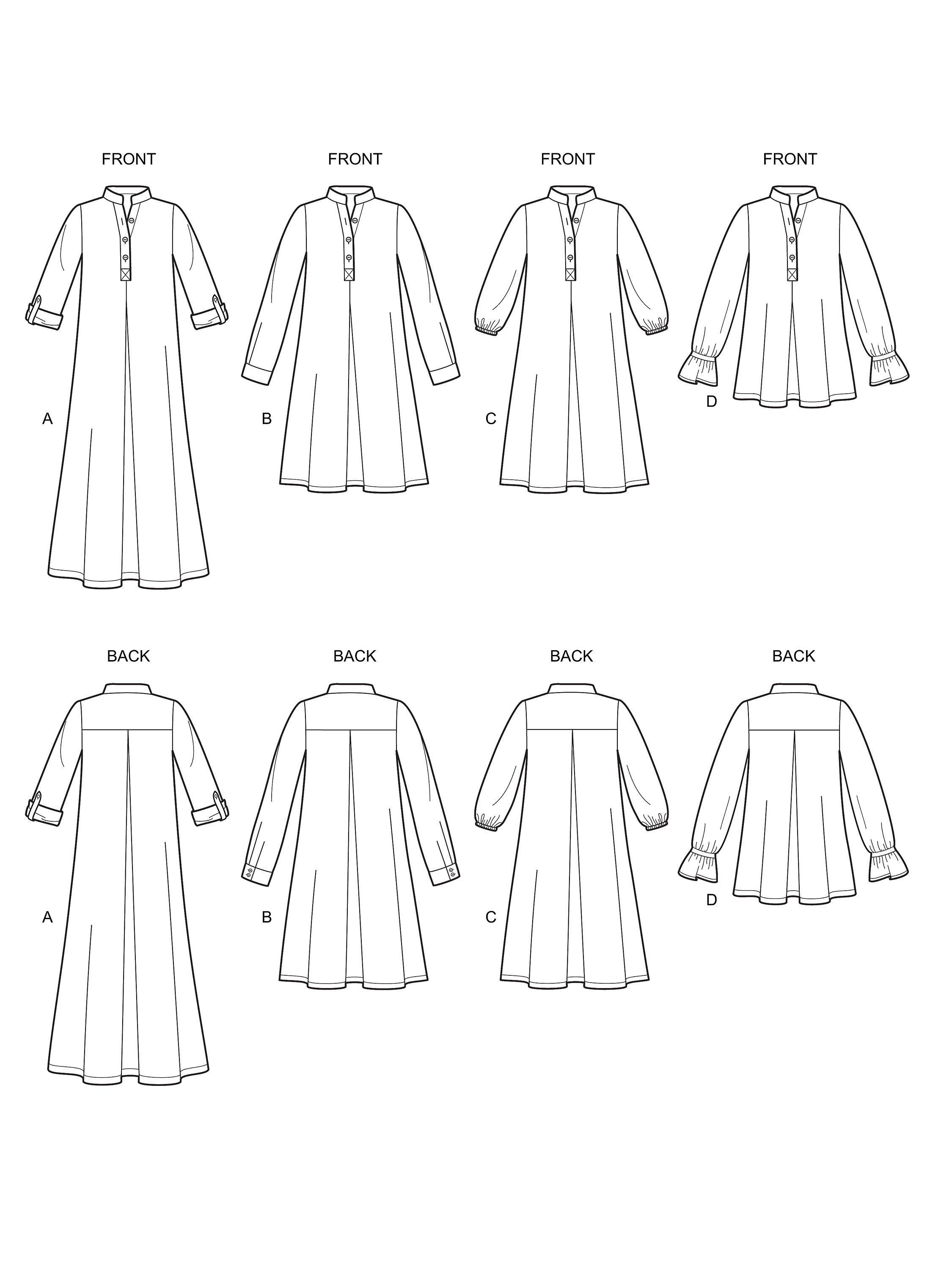 Following the step-by-step instructions, you can create loose-fitting dresses and tops with small stand collars, three-button neck fastenings and back yokes. With sleeve style and length variations, this pattern is suitable for light-to-medium-weight woven fabrics.