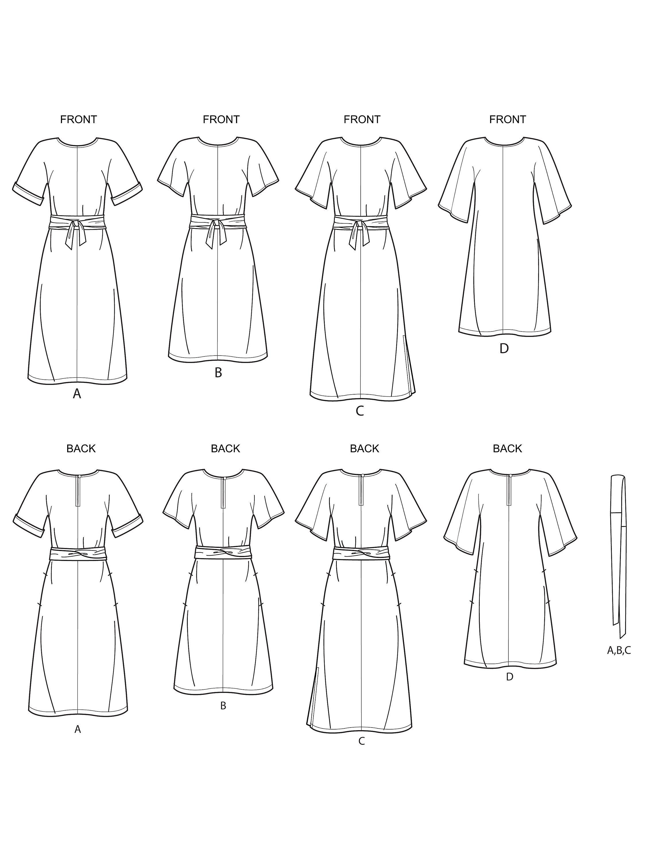 Following the step-by-step instructions, you can create pull-on styles with centre front and back seams and fastening at the back neck. With an obi-style belt option and varying dress and sleeve lengths, this pattern is suitable for light-to-medium weight fabrics.