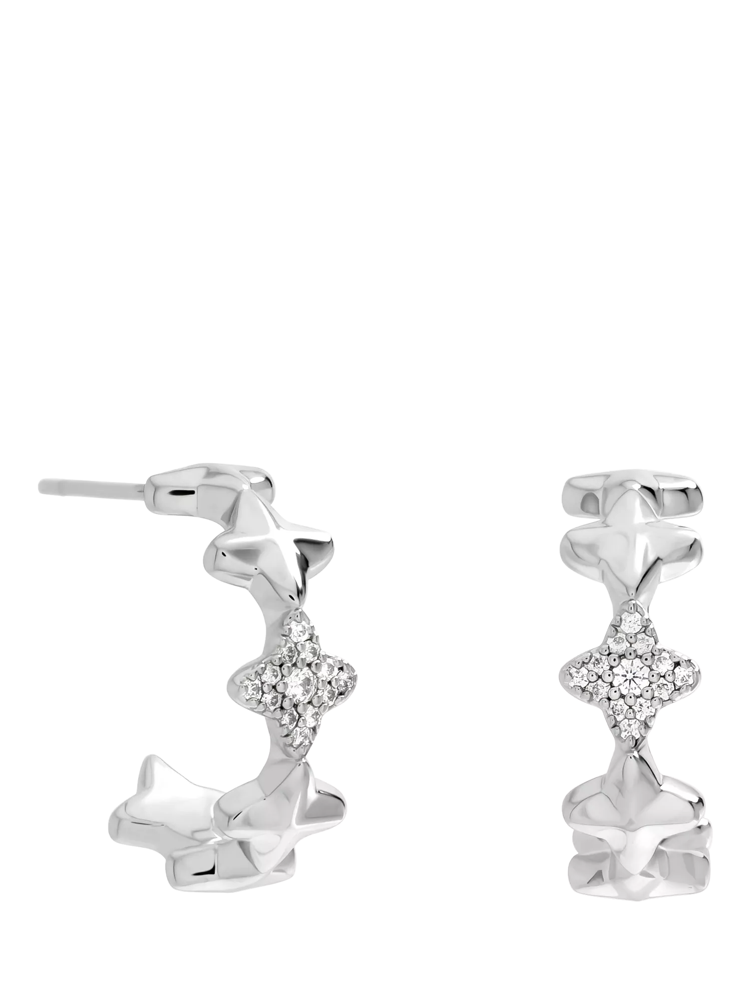 The Simply Silver Celestial Star Hoop Earrings are a statement of cosmic chic. These distinctive, small open hoops are crafted in a polished silver and feature a striking blend of textures. The design is detailed with sculpted pave and polished stars, they offer brilliant shine and an edgy, celestial elegance, perfect for adding unique interest to your everyday ear stack. Suitable for pierced ears only.