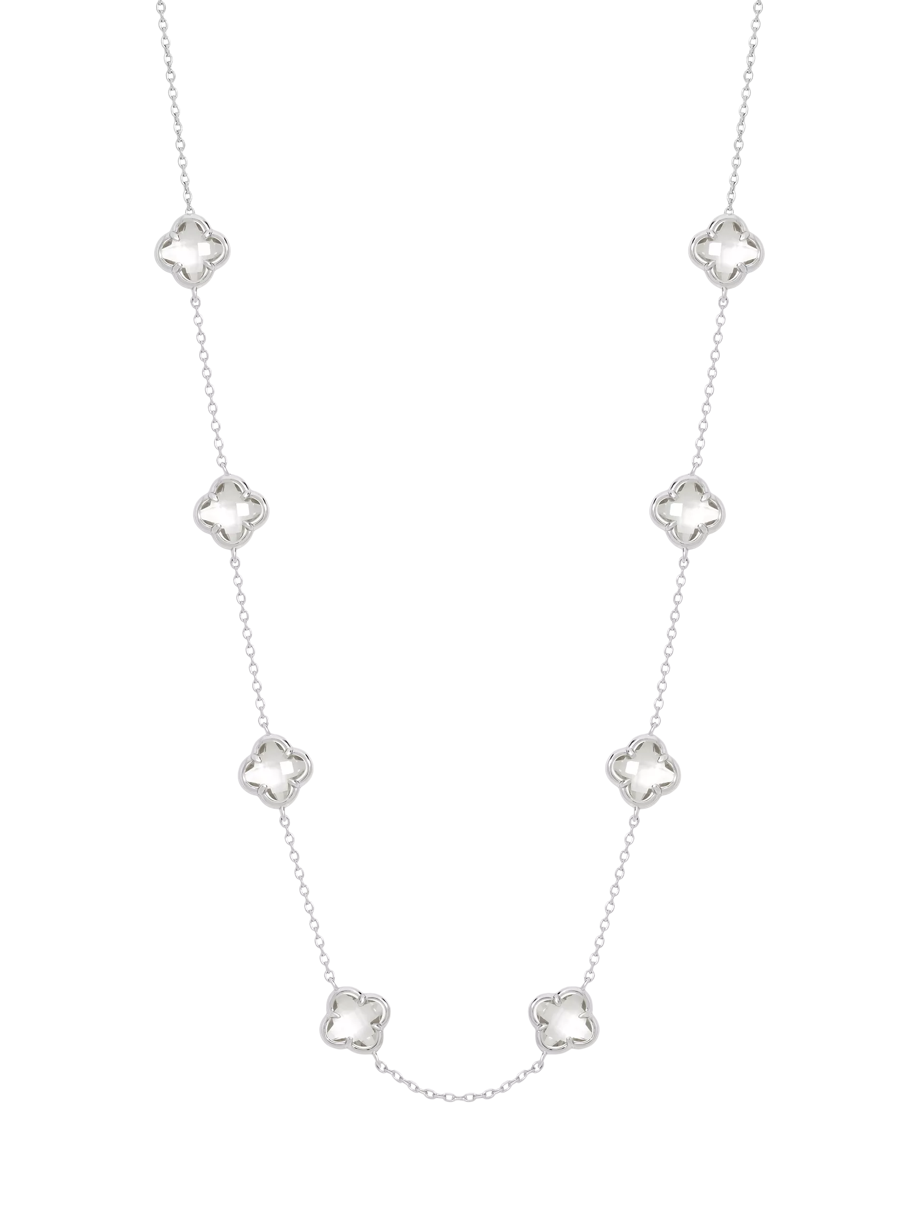 The Simply Silver Crystal Clover Necklace features a delicate silver chain adorned with four evenly spaced clover stations. Each station showcases brilliant crystal stones cut precisely into the shape of a clover. This beautiful piece adds a charming sparkle and a touch of luck to your look, making it a perfect statement necklace for layering or elegant standalone wear. Our 3 micron sterling silver plating uses a heavy, premium layer of silver that delivers a brighter finish, greater resistance to tarnish and wear, and significantly longer lasting quality than standard plated jewellery.