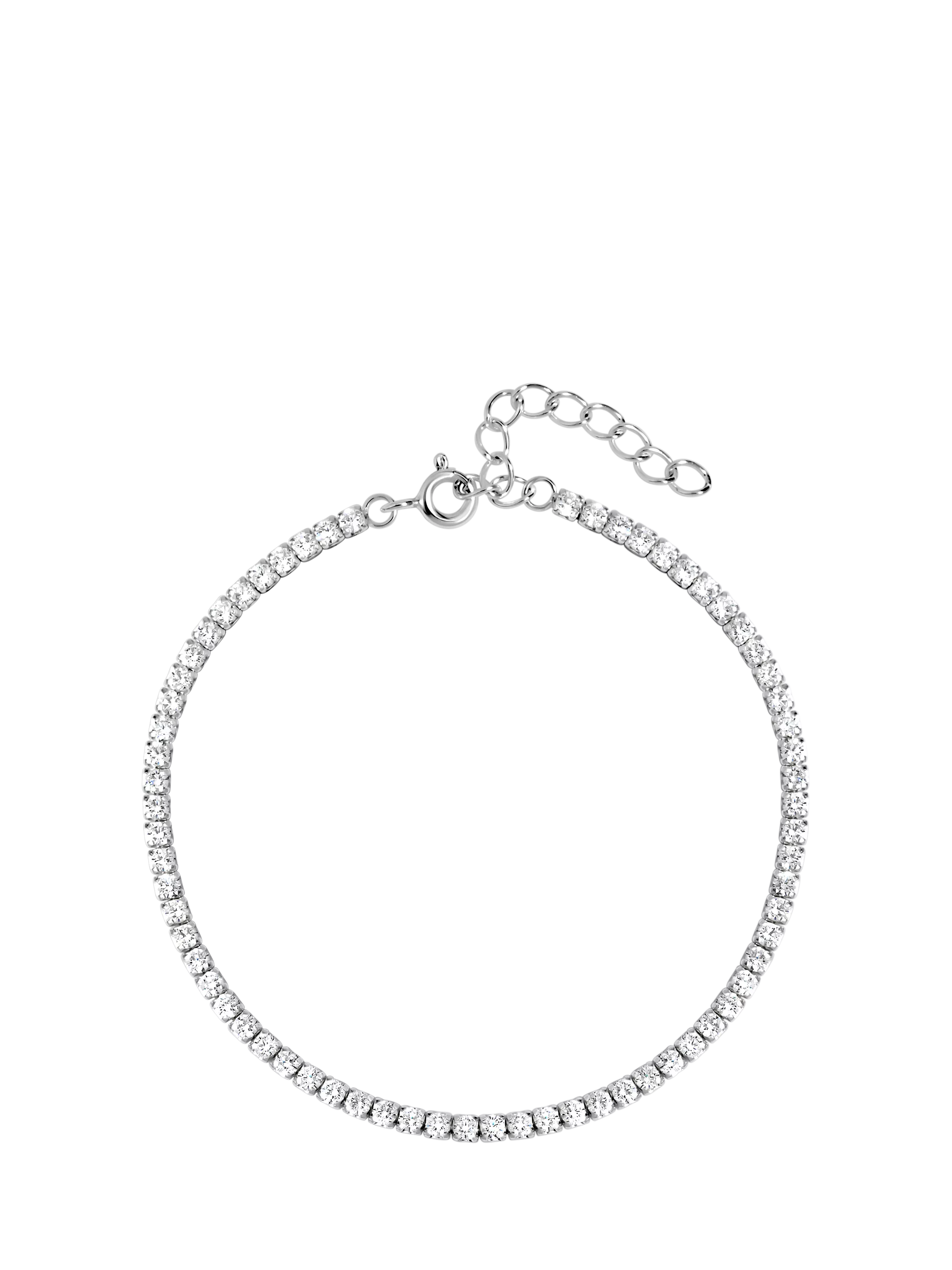 A chic yet charming choice, this tennis bracelet from Simply Silver features a continuous row of finely set cubic zirconia stones, set closely along a sleek sterling silver band. Fastened with a lobster claw clasp.