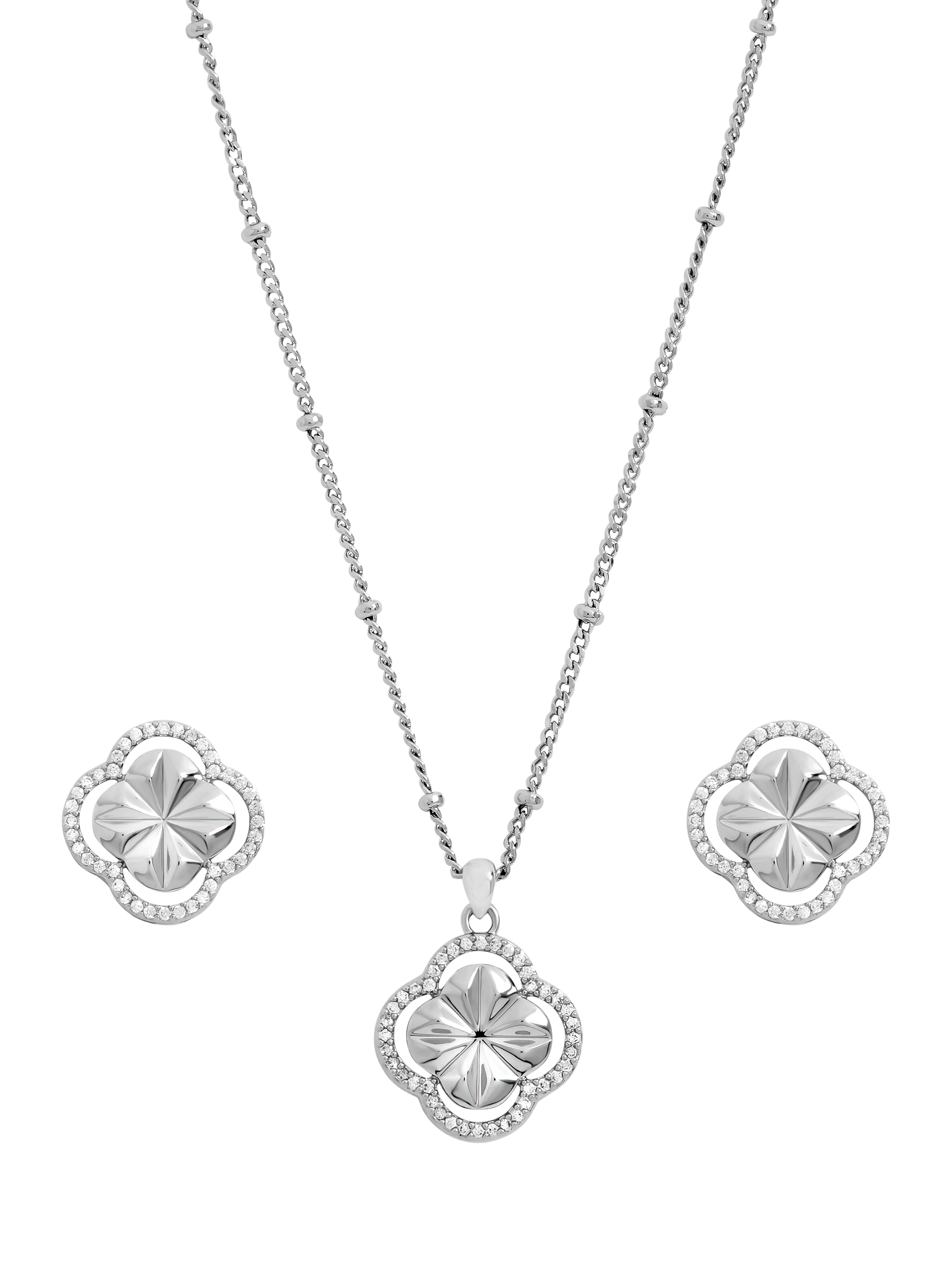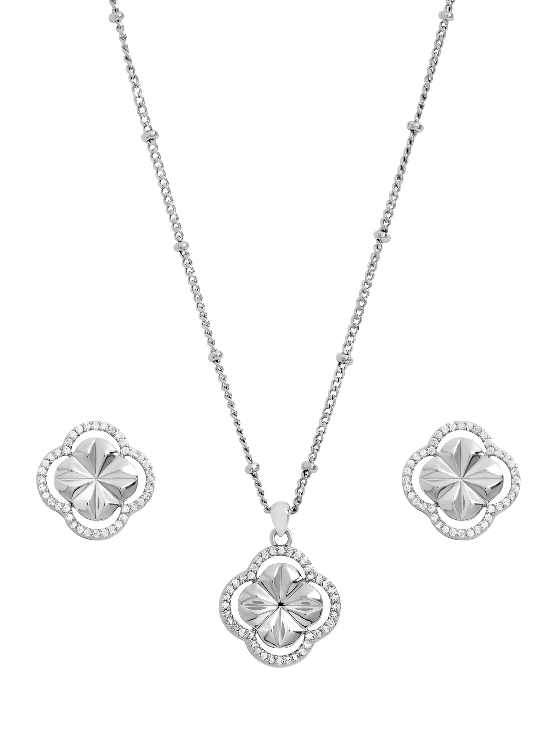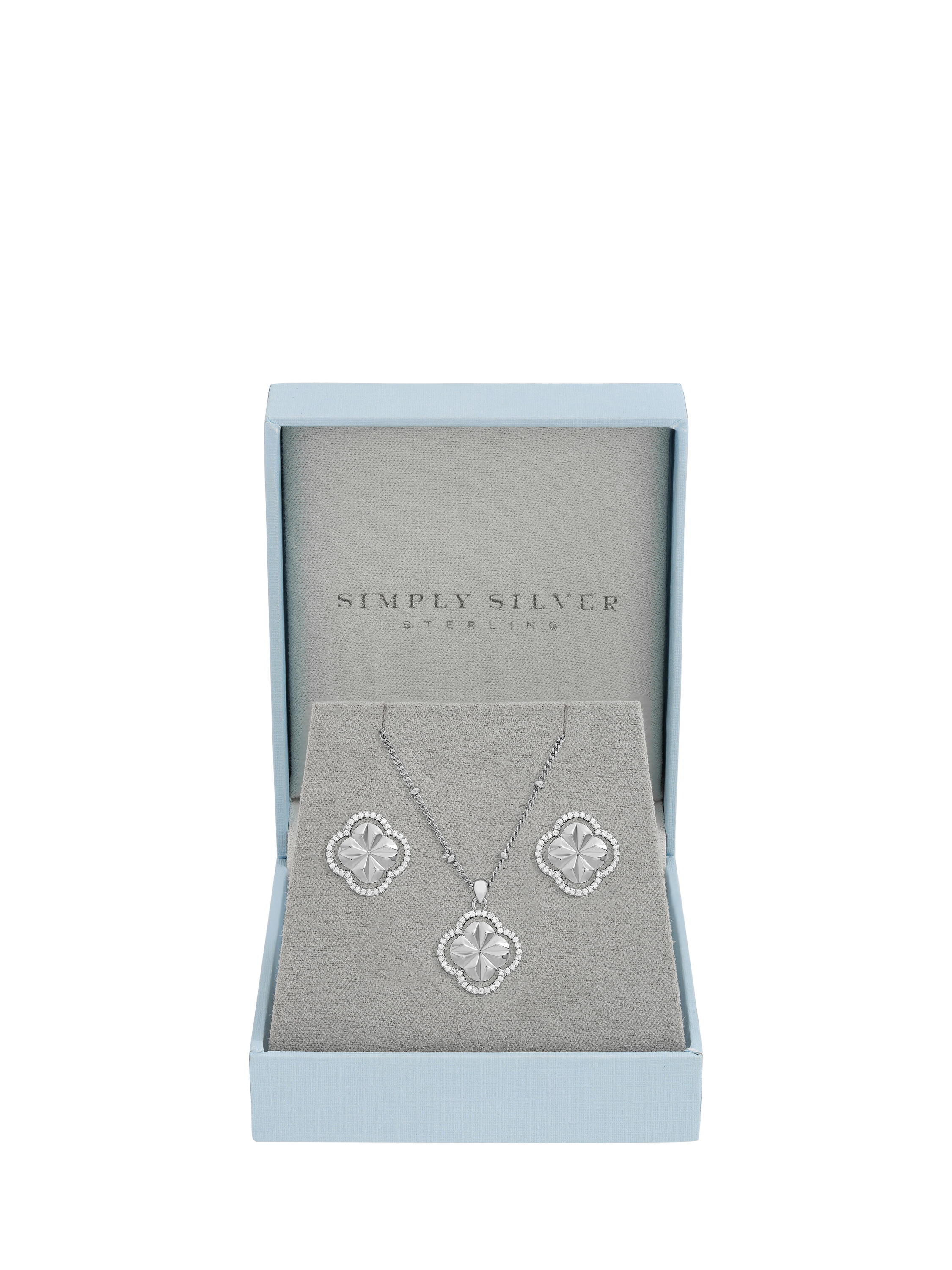 The Simply Silver Diamond Cut Clover Set offers a touch of lucky charm and a symbol of good fortune. This beautiful gift set includes a matching clover pendant necklace and earrings. Both pieces are crafted in polished sterling silver plating and feature a precise diamond-cut finish. Perfect for gifting to mark a birthday, anniversary, or any special celebration. Suitable for pierced ears only.