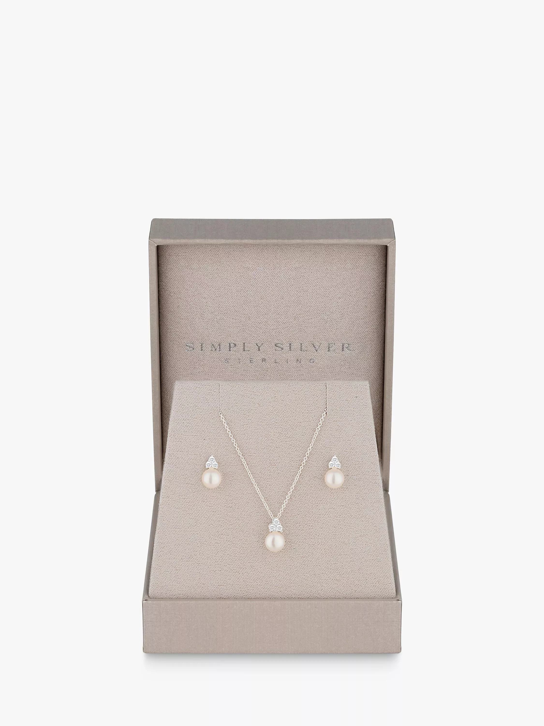 In a coordinating set with a necklace and a pair of stud earrings, this jewellery set by Simply Silver is detailed with freshwater pearl and lends your jewellery trinket a refresh.