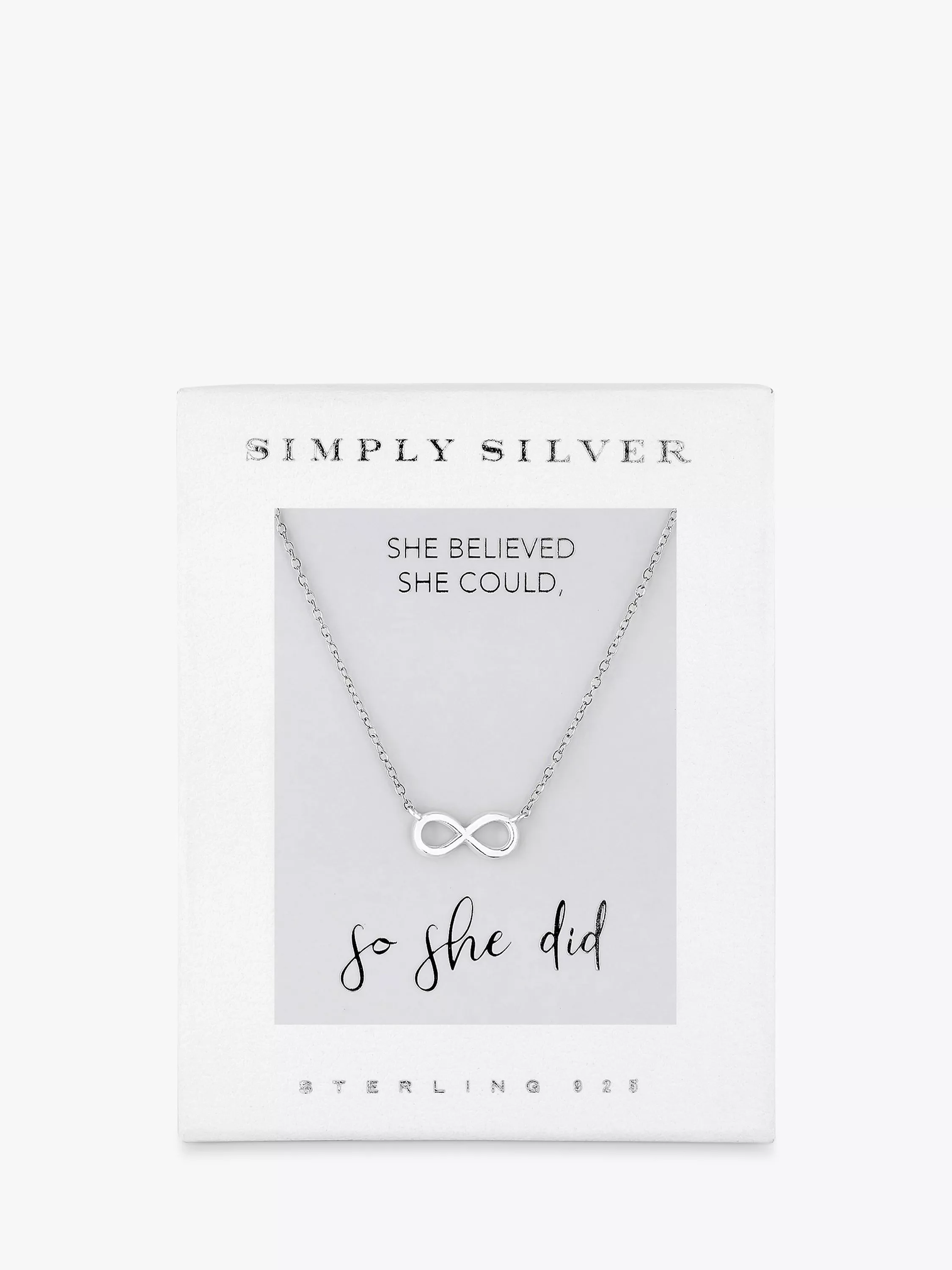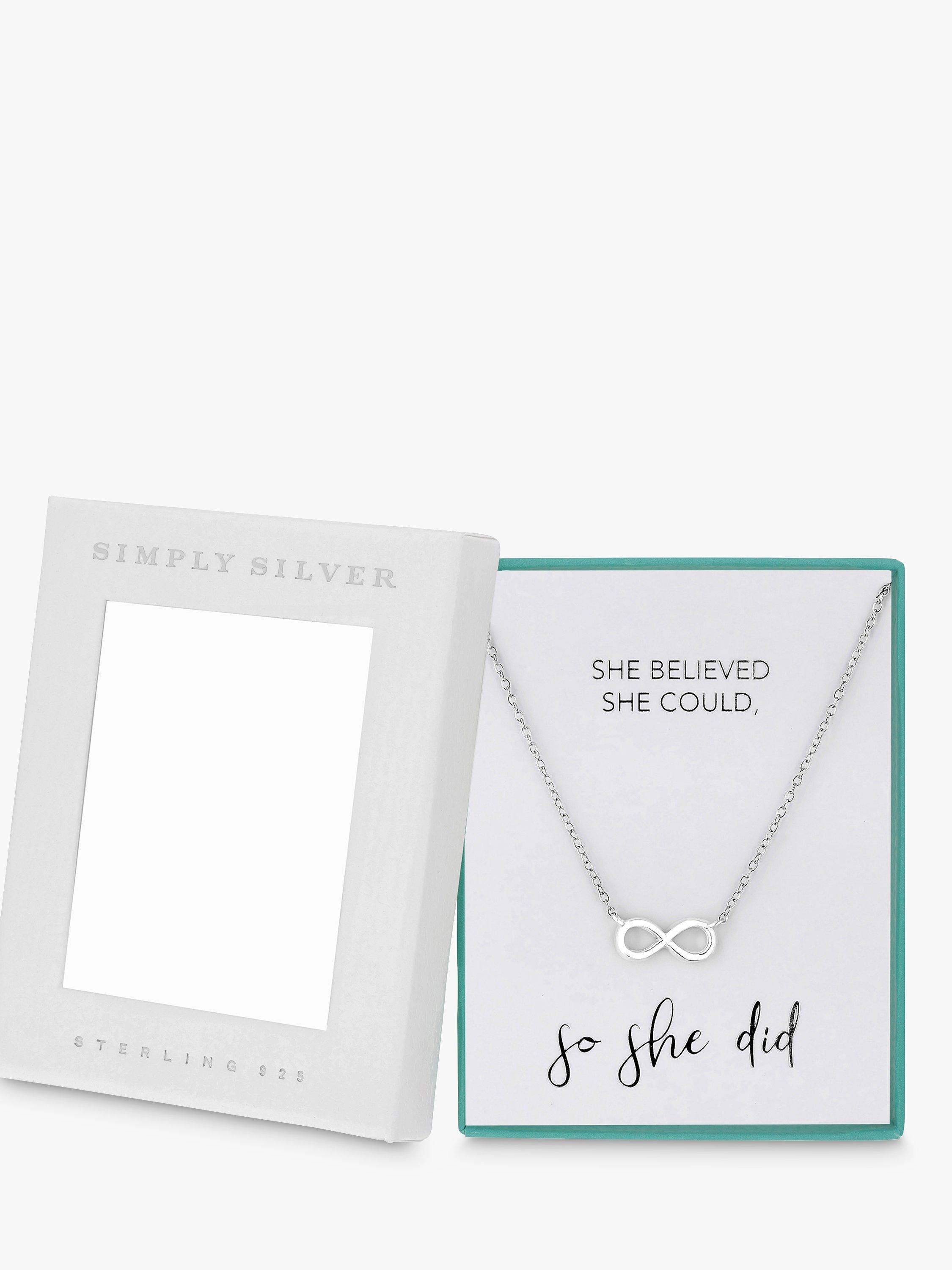 Perfect for gifting, the Simply Silver infinity necklace is beautifully presented in a white gift box with the message 'She Believed She Could So She Did'. This product is secured with a lobster clasp fastening and is made from 925 sterling silver.