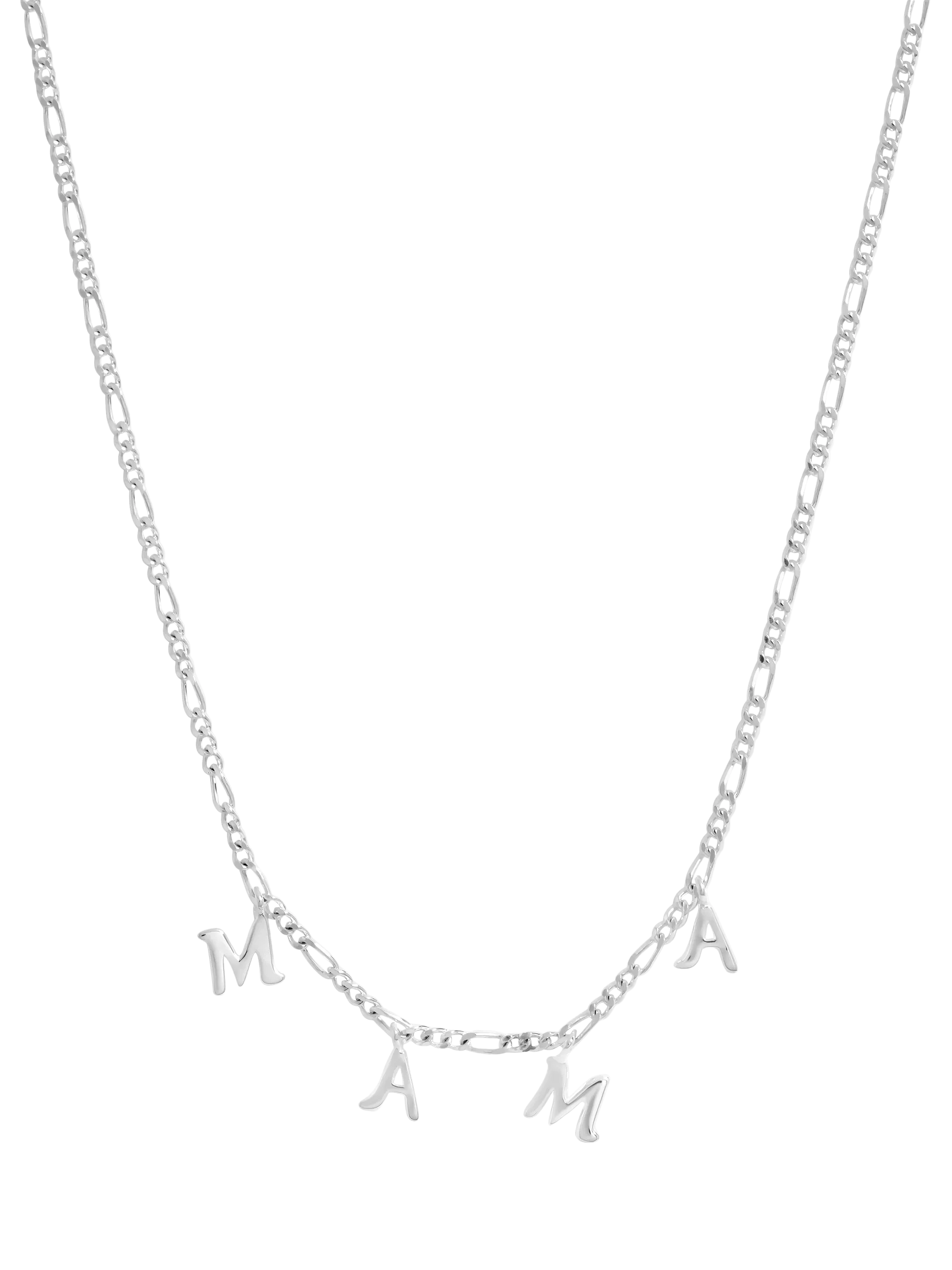 The Simply Silver Mama Necklace combines timeless elegance with a meaningful touch. The polished sterling silver plated Mama necklace features letters spaced along a delicate Figaro chain, creating a chic and modern design that's both stylish and sentimental. Lightweight and versatile, it sits beautifully on the neckline, making it perfect for layering or wearing alone as a statement piece. Presented in a drawer box, ready to gift, it's the perfect way to celebrate Mother's Day, birthdays, or simply show a cherished Mum how much she means. A thoughtful keepsake she'll treasure forever.