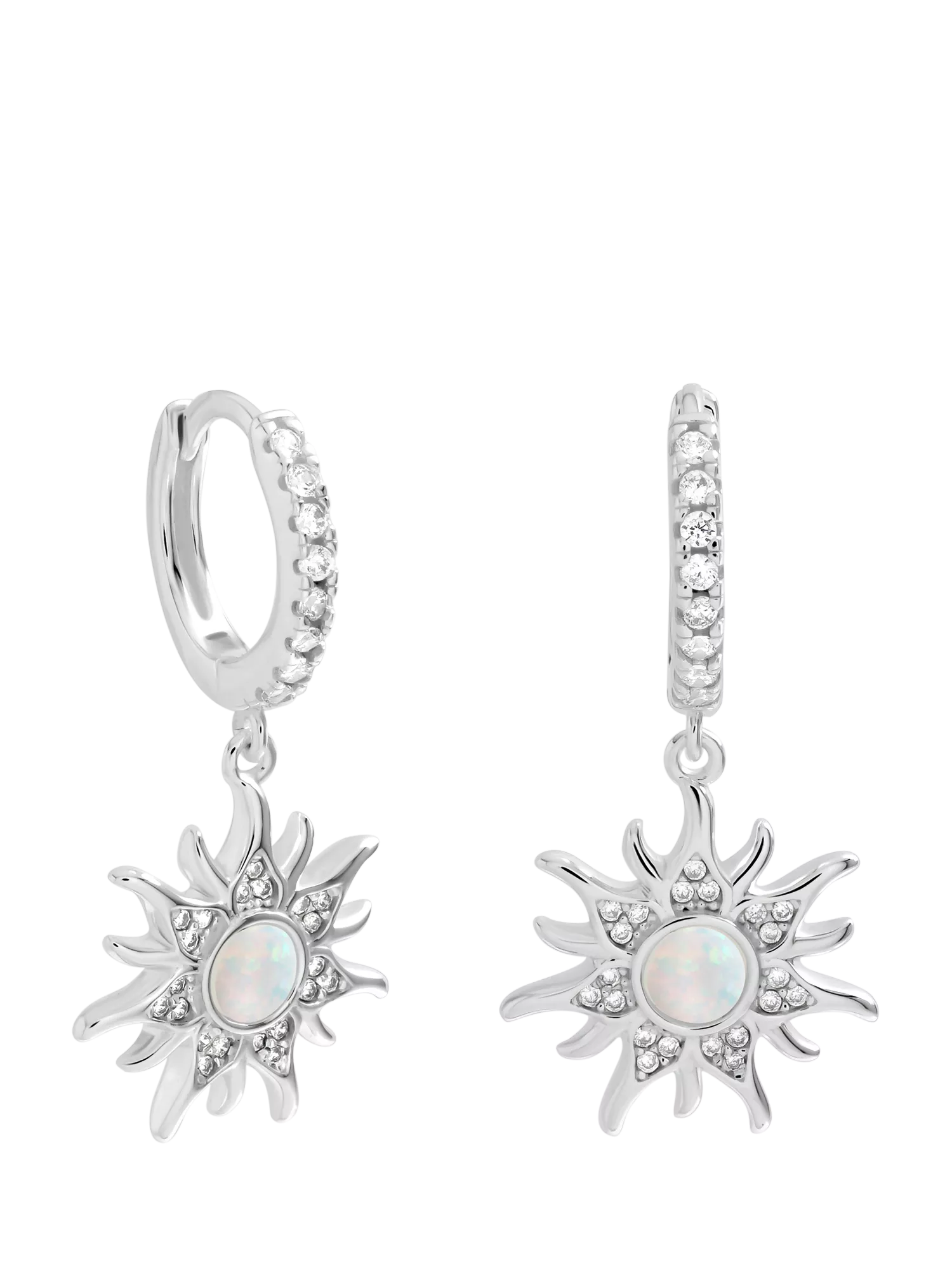 The Simply Silver Opal Sunburst Charm Hoops bring a touch of elegance and sparkle to any outfit. Crafted in polished sterling silver plating, each hoop features a radiant sunburst charm accented with a luminous opal, creating a delicate, iridescent shimmer. Lightweight and versatile, they're perfect for everyday wear or adding a subtle, refined accent to dressier looks. Suitable for pierced ears only.