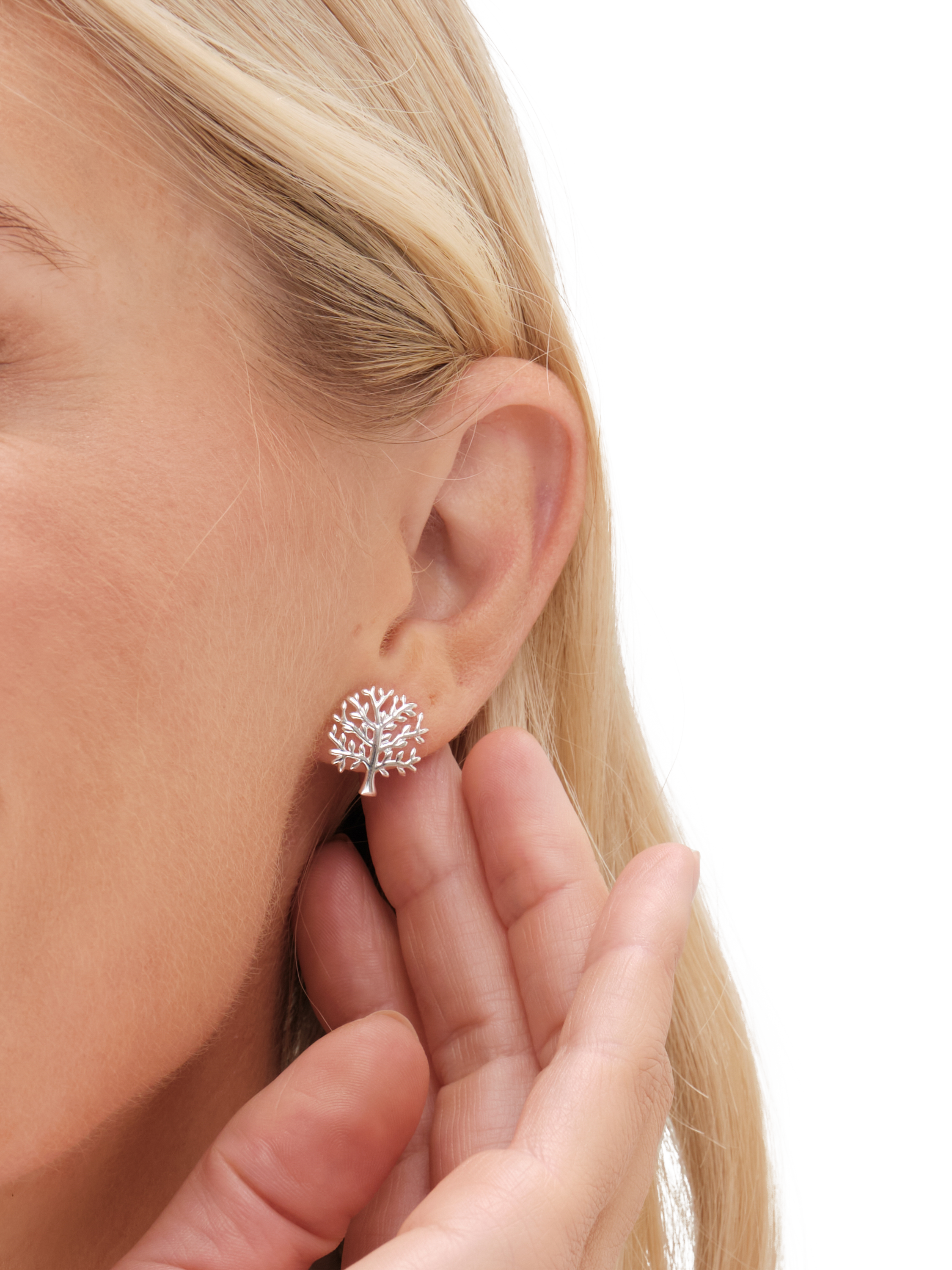 These polished stud earrings feature a graceful tree design, with a sleek and sophisticated finish. These earrings symbolize growth and strength, offering a meaningful touch. Perfect for gifting to a loved one. Secured with a post and catch fastening.