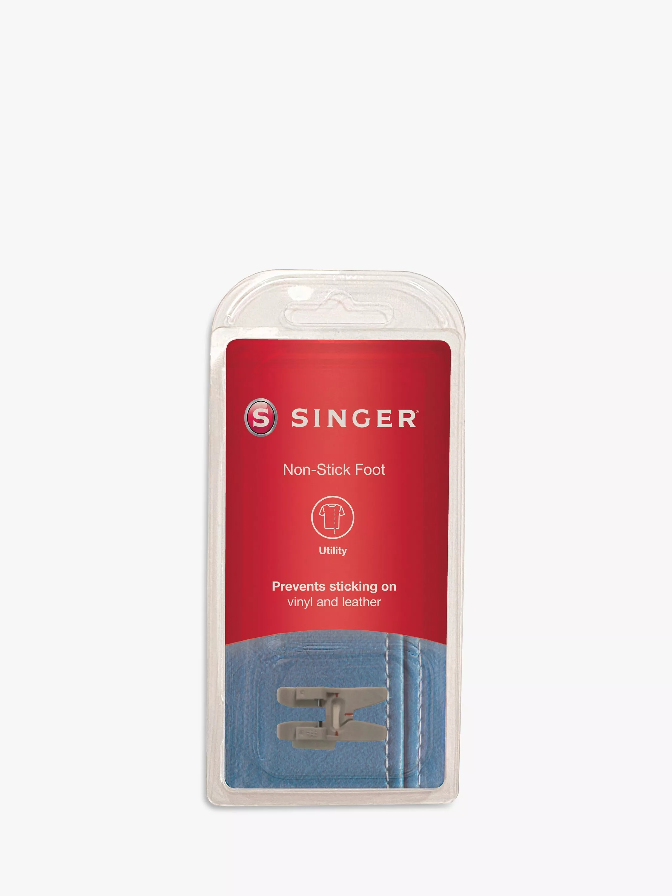 The Singer nonstick foot has a slick surface on the underside of the foot that allows for effortless sewing on tricky fabrics. Perfect for sewing seams on leather, plastic and vinyl.