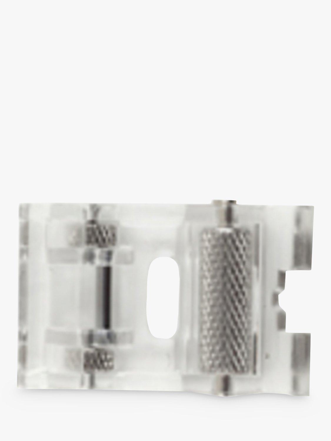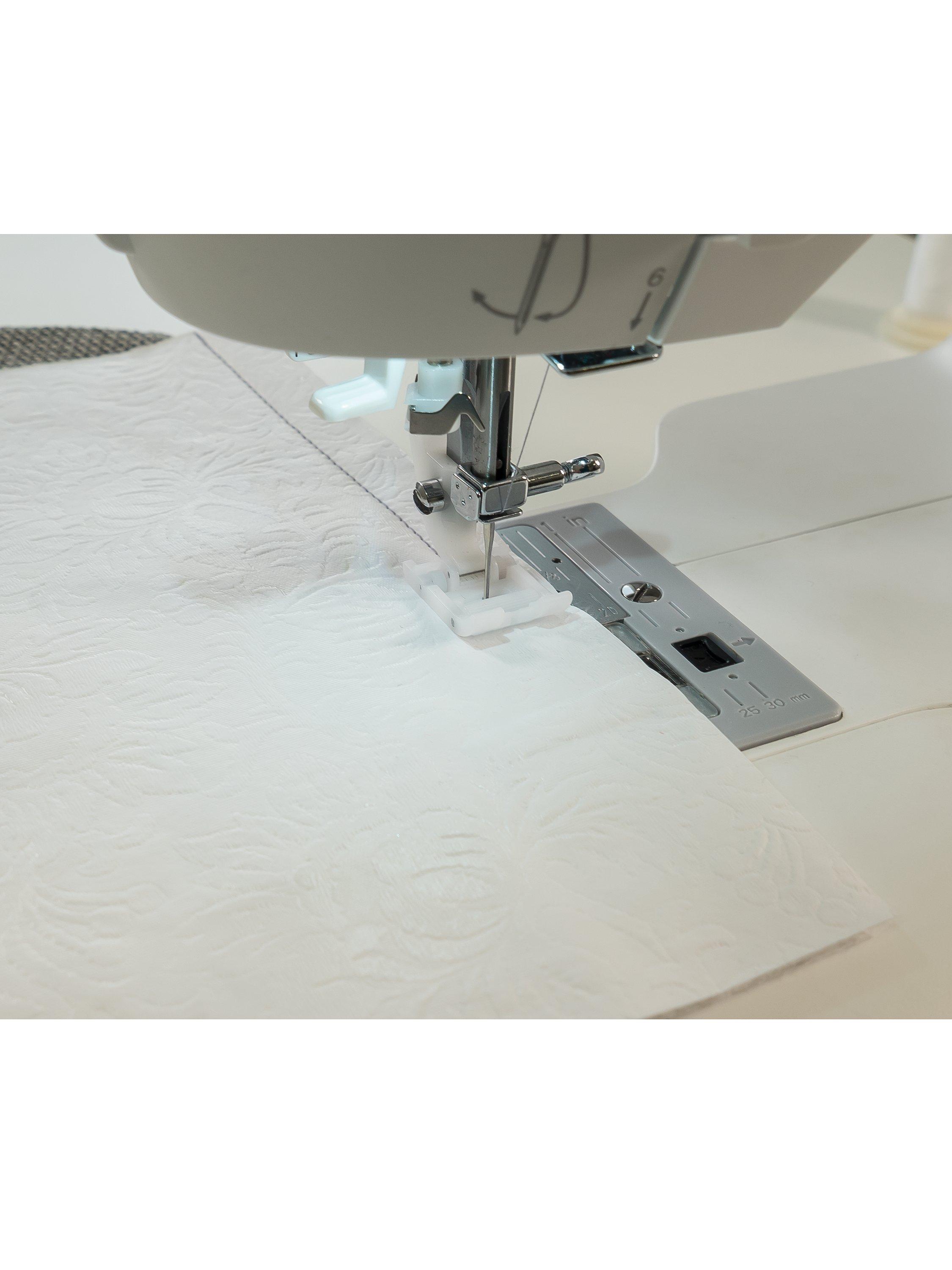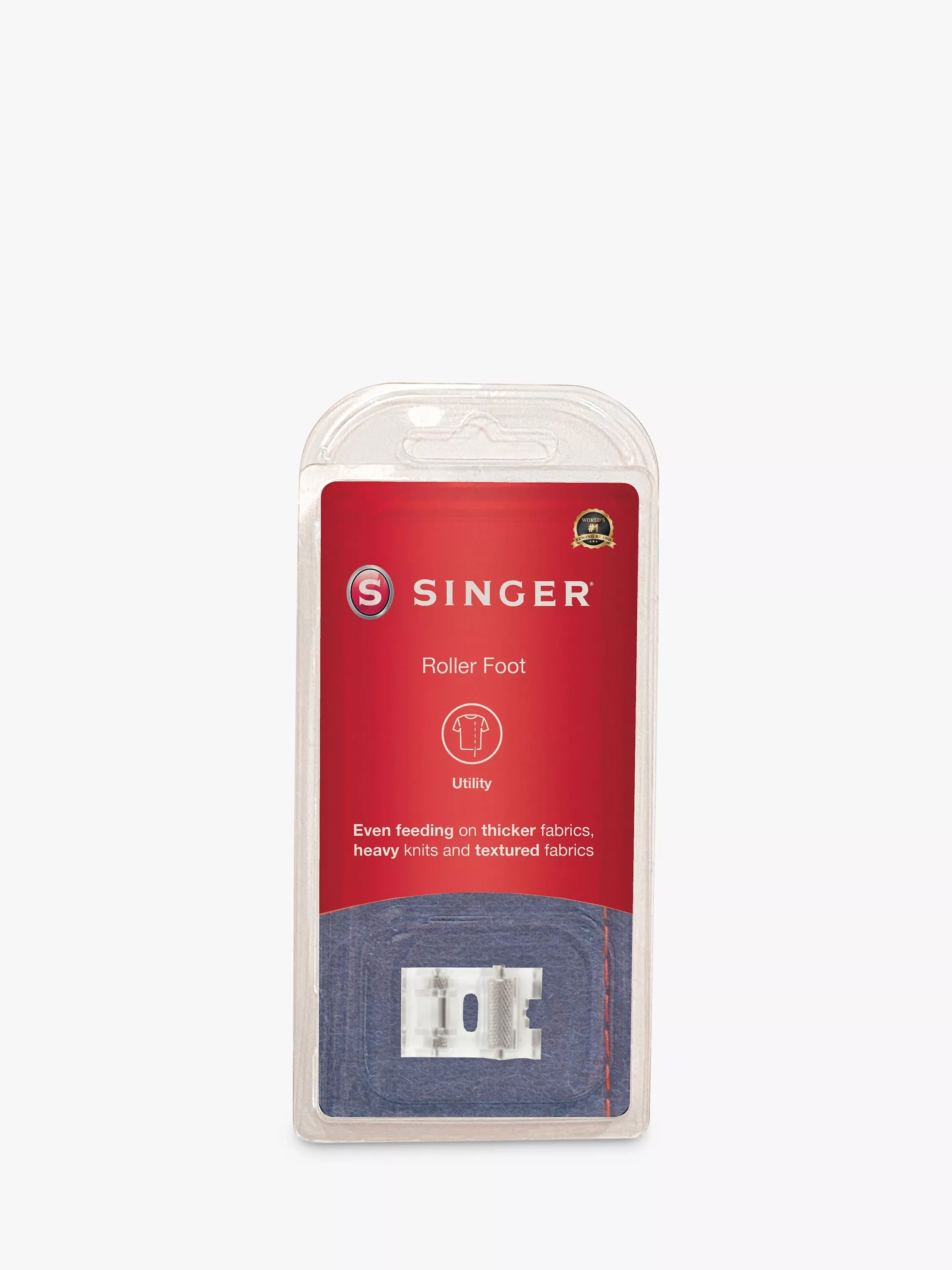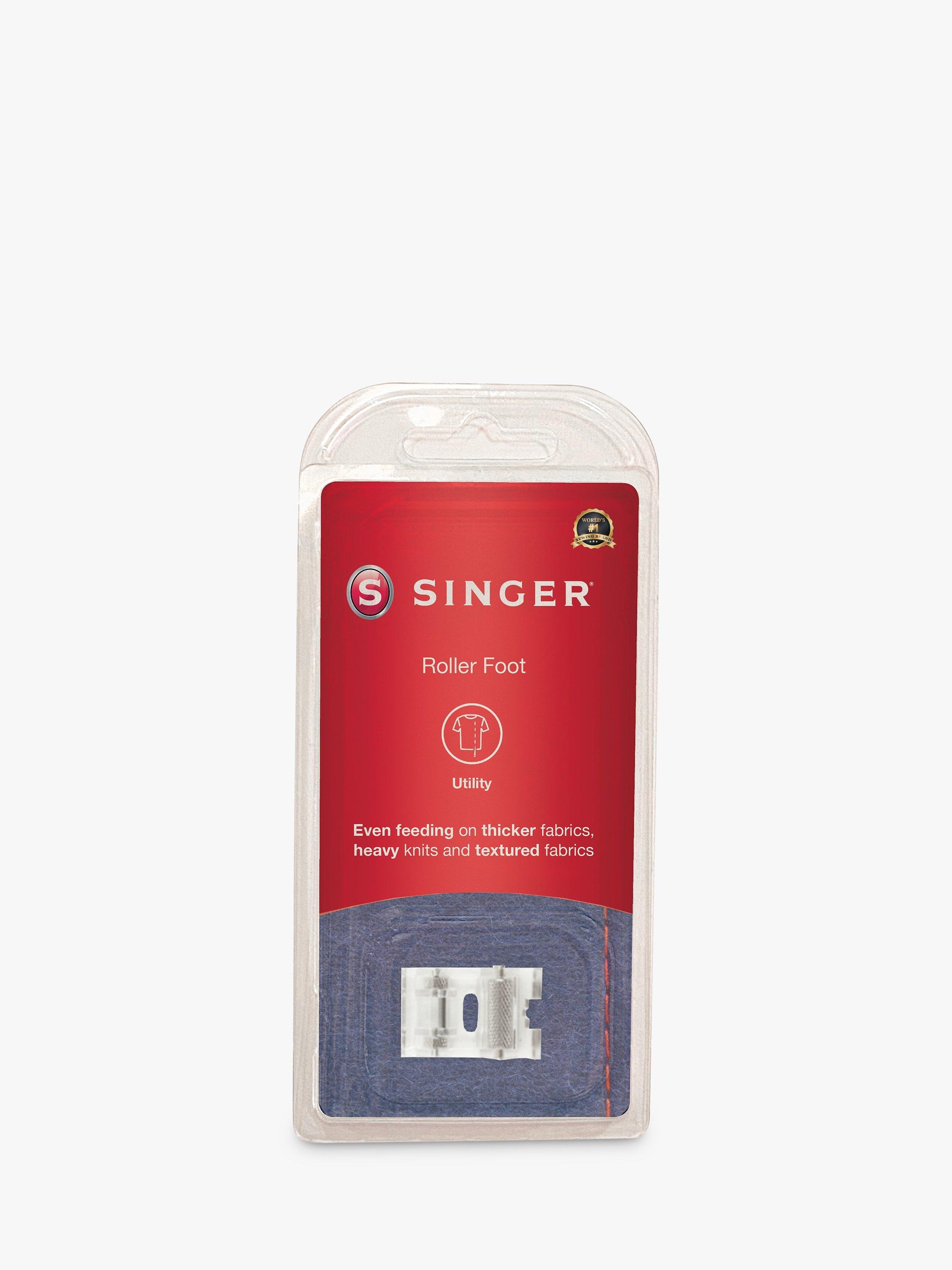 The Singer roller foot is great for sewing thicker fabrics, heavy knits and textured or napped fabrics. Even fabric feeding is achieved thanks to the longer roller on the front of the presser foot.