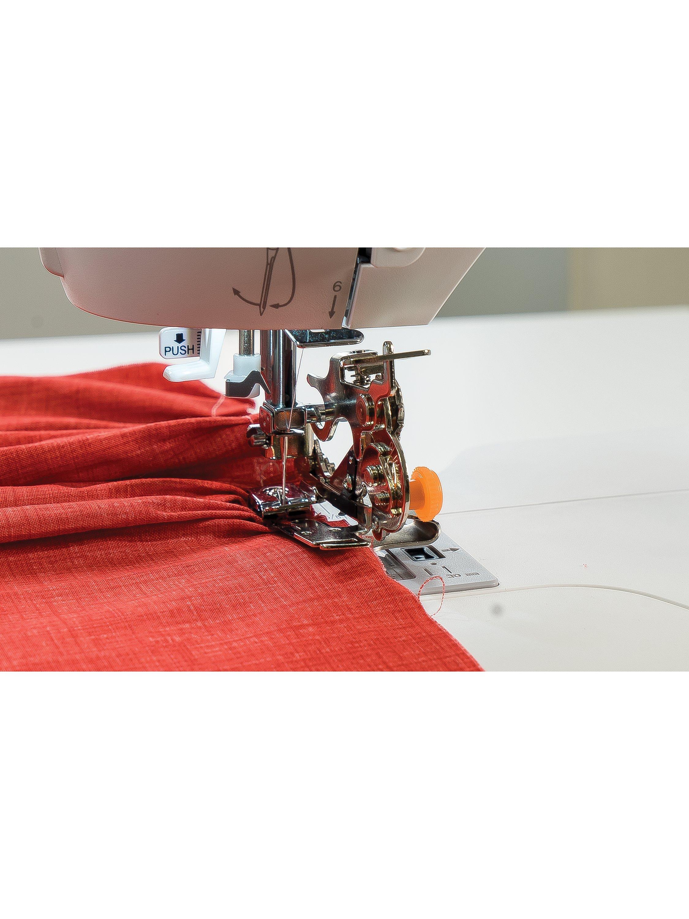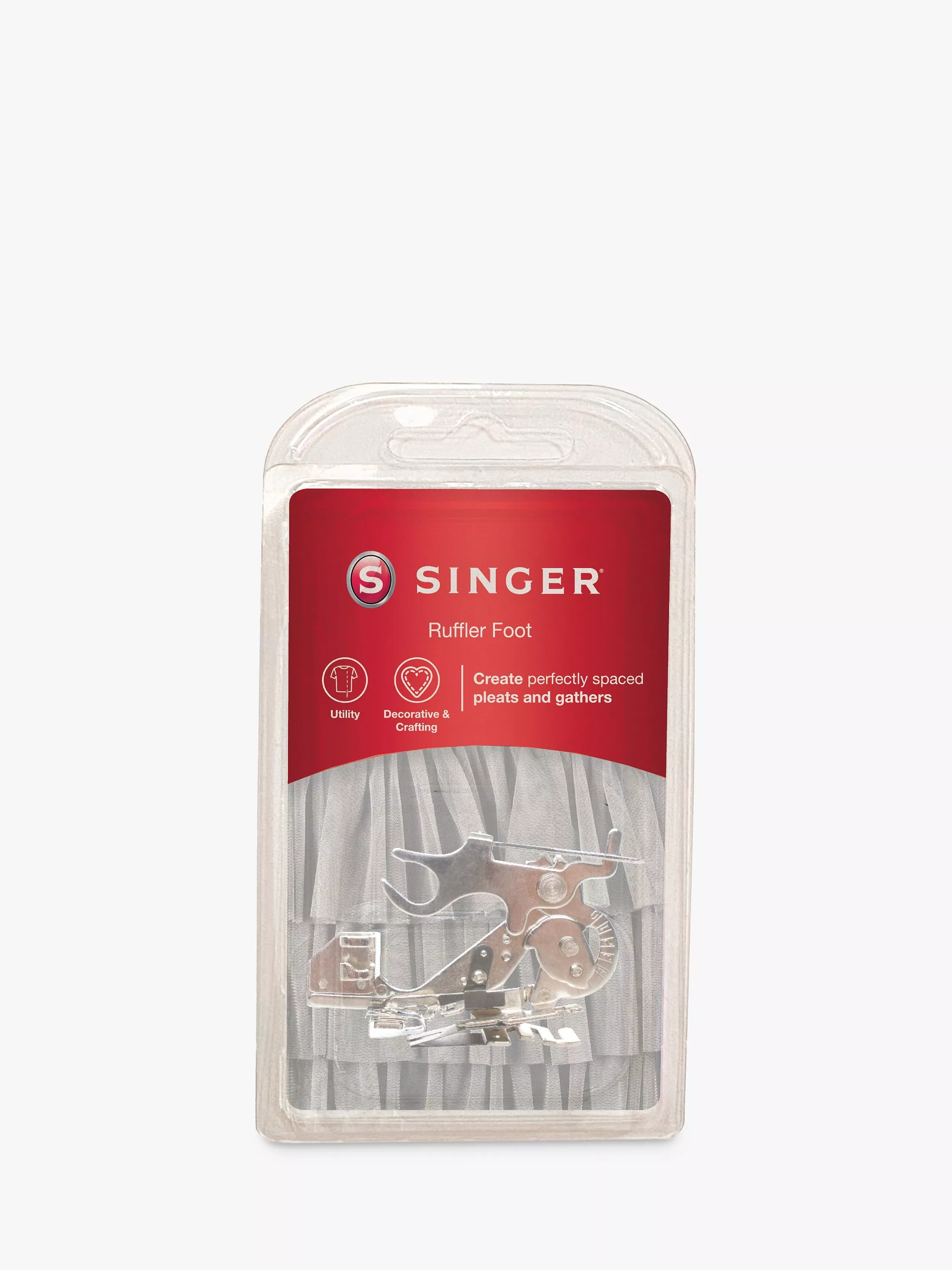 The Singer ruffler foot, creates uniformly spaced pleats automatically while sewing. Easily adjust the closeness and depth of the pleats; perfect for home decor, ruffles and frills.
