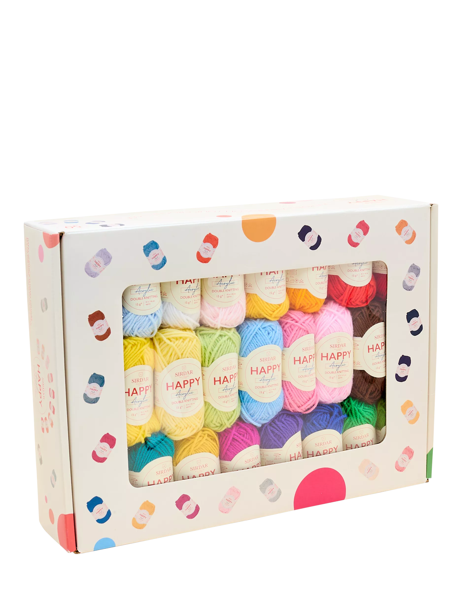 50 Happy Colours in one happy box! This irresistible box of happiness is filled with fun 15g balls of double knitting yarn in 50 colours.