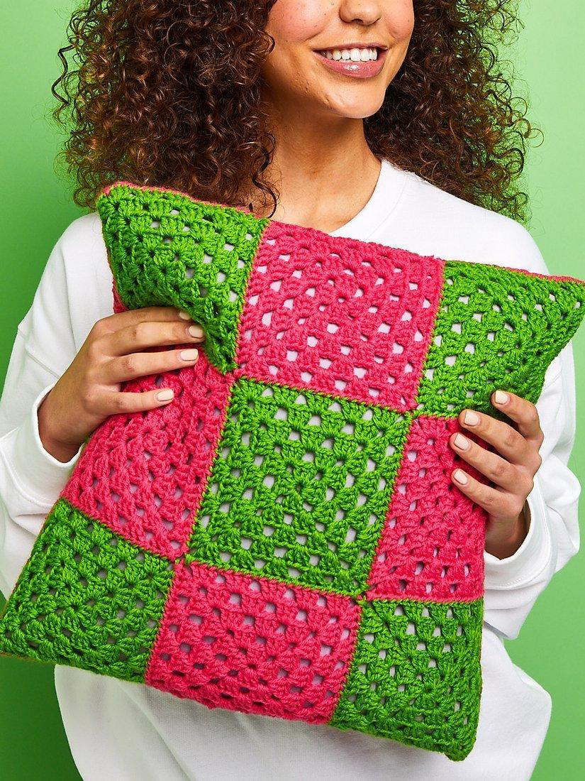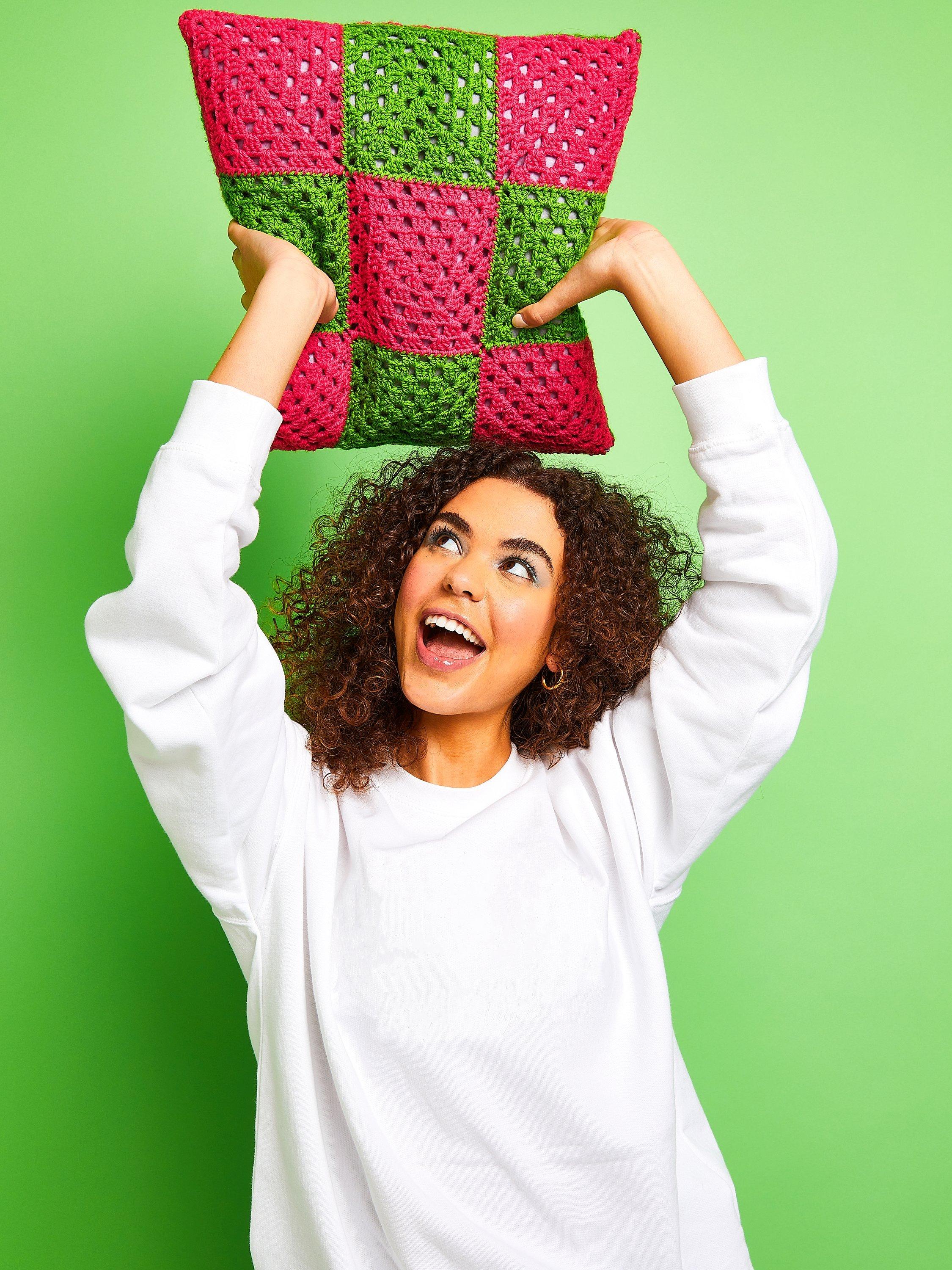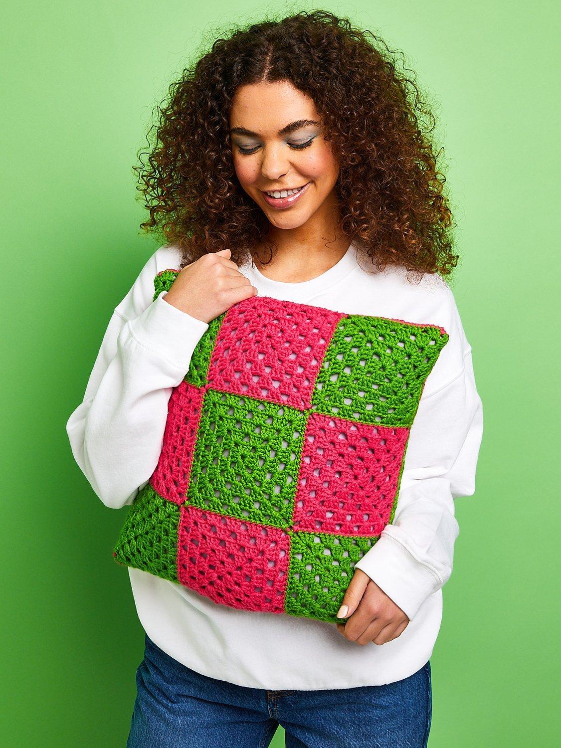 Classic granny squares are simple to create and form this fun cushion, sure to add a bright pop of colour to your sofa.
