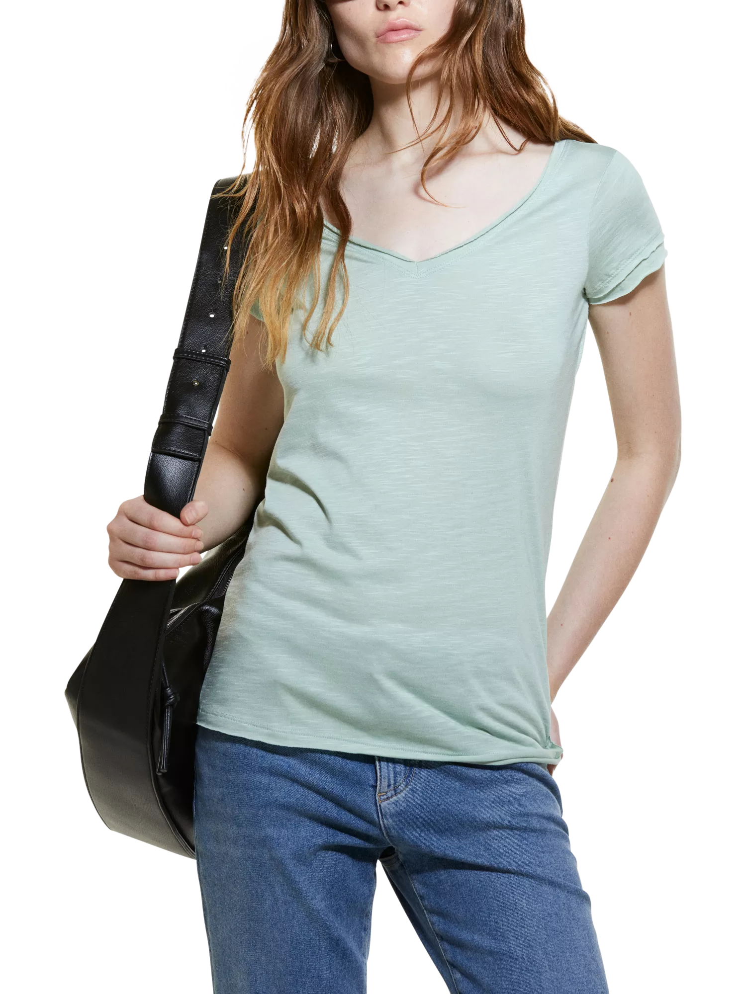 Regular fit t-shirt in organic cotton and Modal® blend jersey. V-neck, short sleeves and raw cut edges.