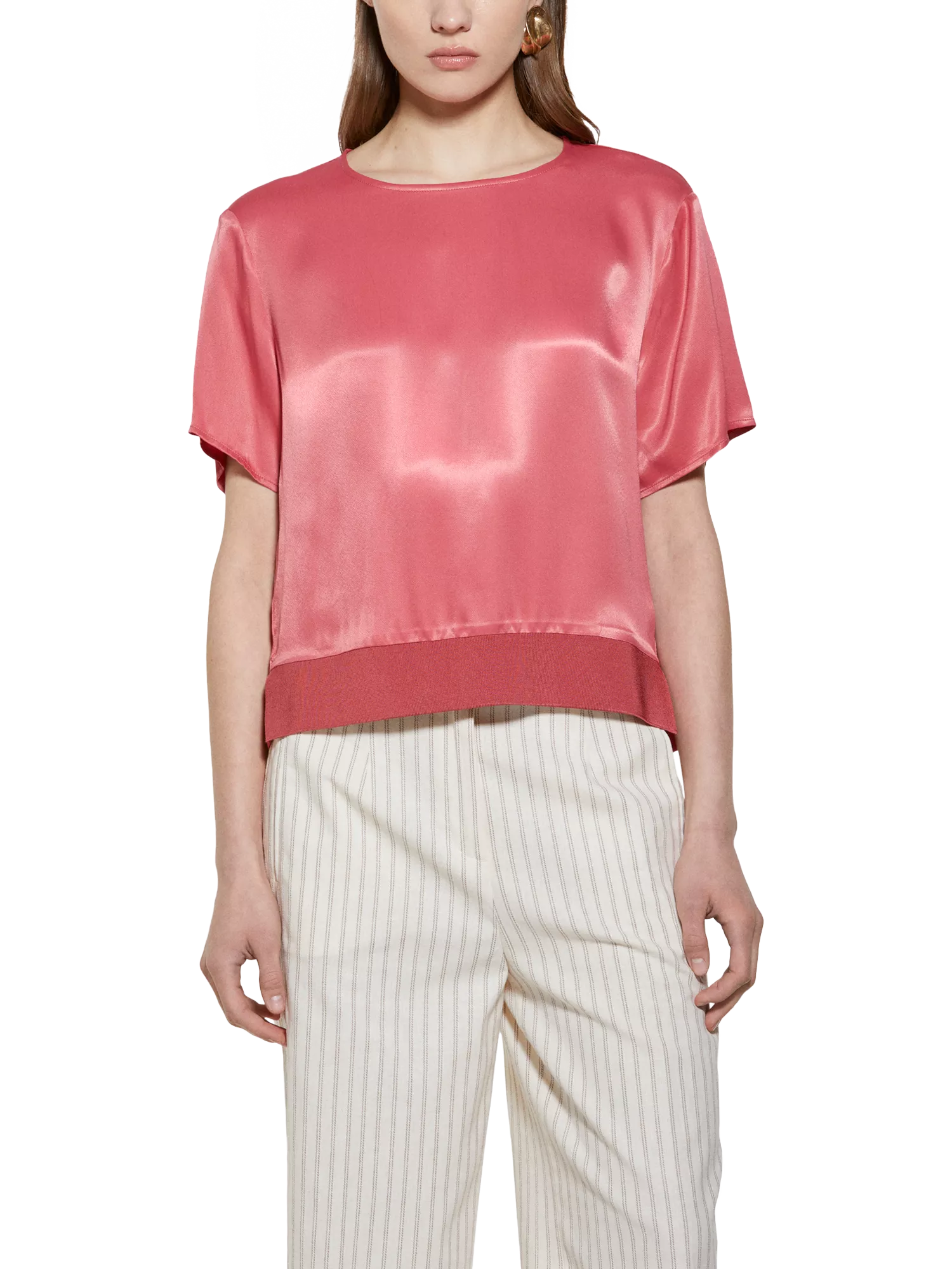 This SISLEY blouse pairs a smooth satin finish with a classic crew neck and practical short sleeves. Designed for all–day comfort, its lightweight construction keeps you cool and ready for any occasion.