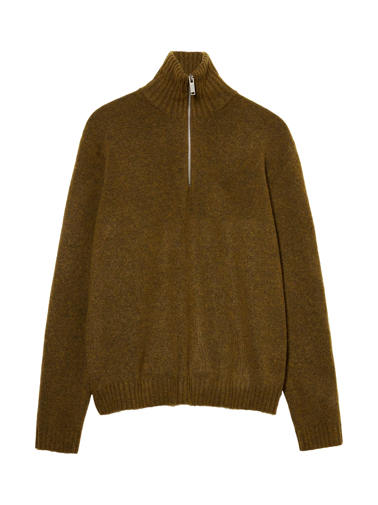Sculpted high-neck half-zip knit, plush hand feel and gentle drape, a relaxed silhouette that layers for crisp mornings and quiet evenings.